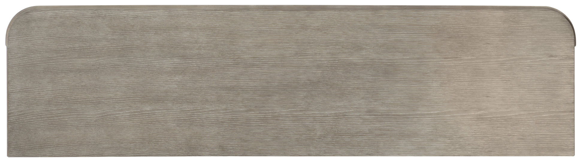 • In a softly rounded form, the Affinity Server combines a greige sand-blasted finish on Quartered Oak Veneers with cream and pewter bar pulls and flared legs