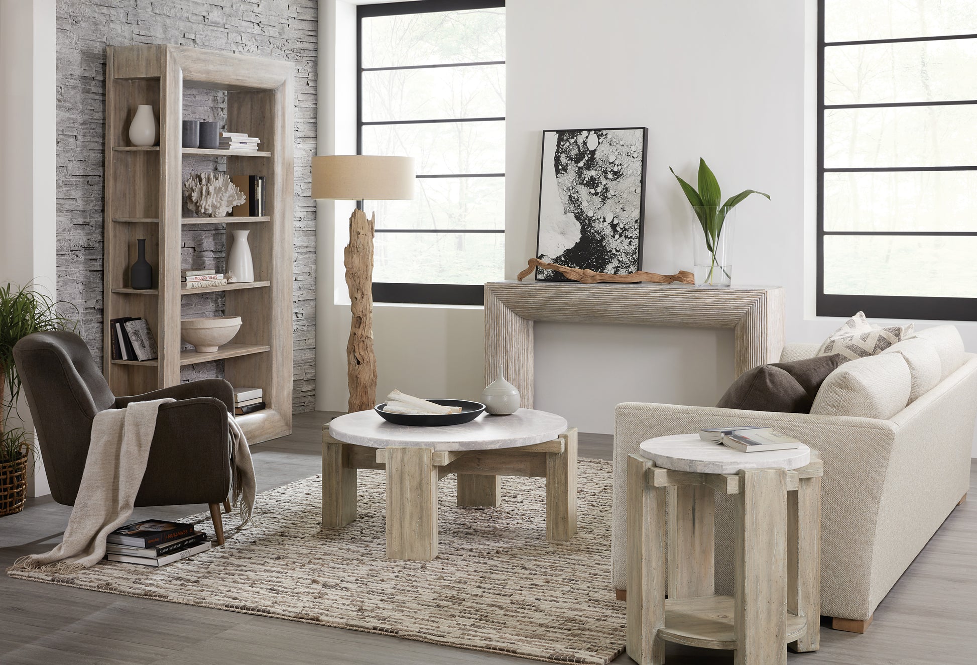 • Infuse your space with tranquility with the organic and chic Armani Sofa Table crafted of Pecan wood with a Crema marble top featuring a soft veneer pattern