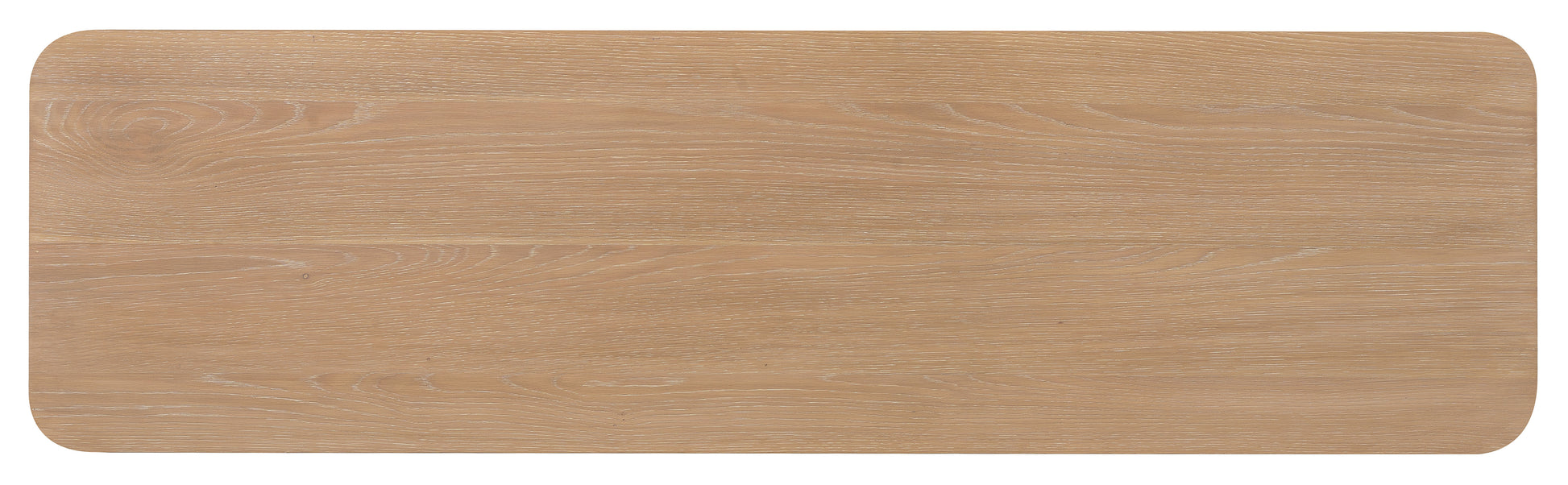 • Featuring white oak solids, oak veneers, and metal, this piece is finished in a light Desert Oak with wire-brushing and cerusing for enhanced texture