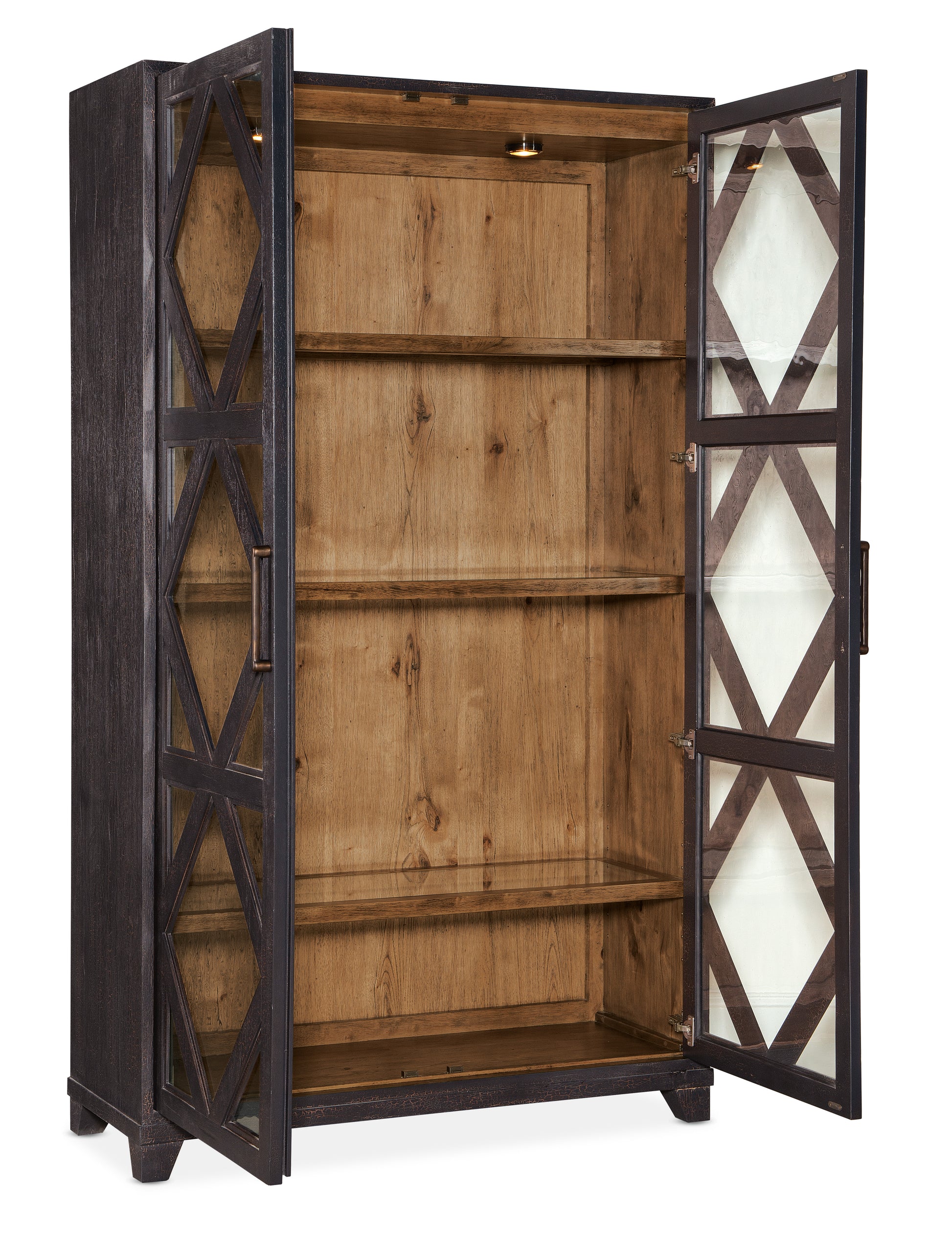 • The Charred Timber finish on the exterior contrasts with a Vintage Natural finish on the interior that reveals the authentic knots and wood grain of the Pecky Hickory Veneers