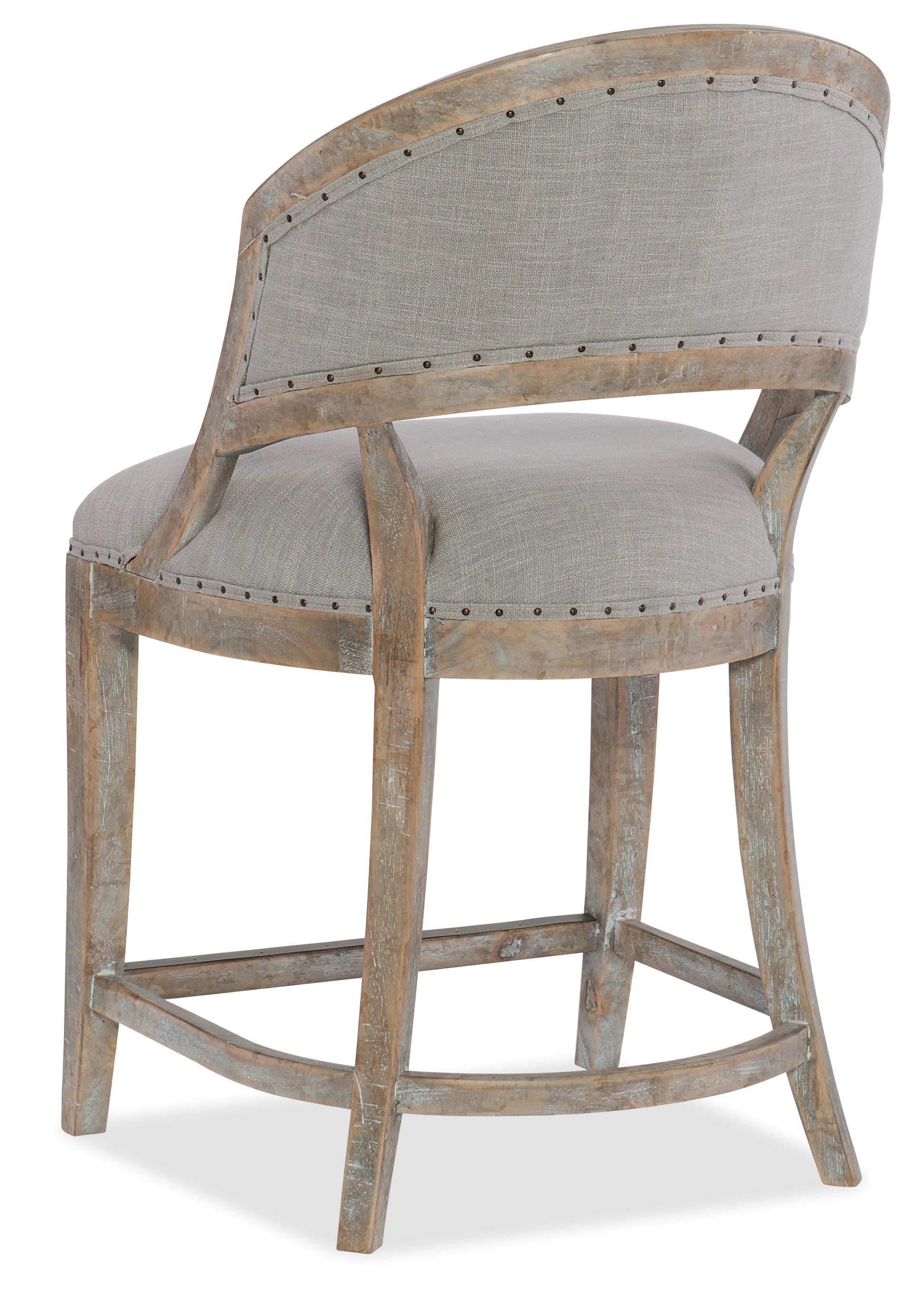 • Design details are delightful, with a nail-lined gimp welt lining the outside of the seat and back, with each stool covered in a soft gray Antwerp Linen fabric