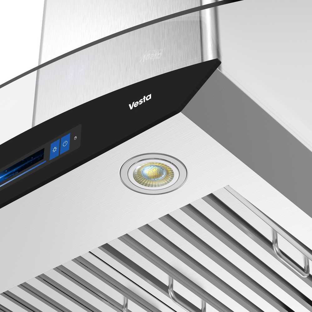 Vesta's Bremen 30" stainless steel wall-mounted range hood is a durable companion for your kitchen. Featuring an ultra strong motor, a touchscreen panel, two baffle filters, a glass canopy, and two LED lights, this unit will elevate your cooking experience to new heights. Here?€?s what makes it exceptional: