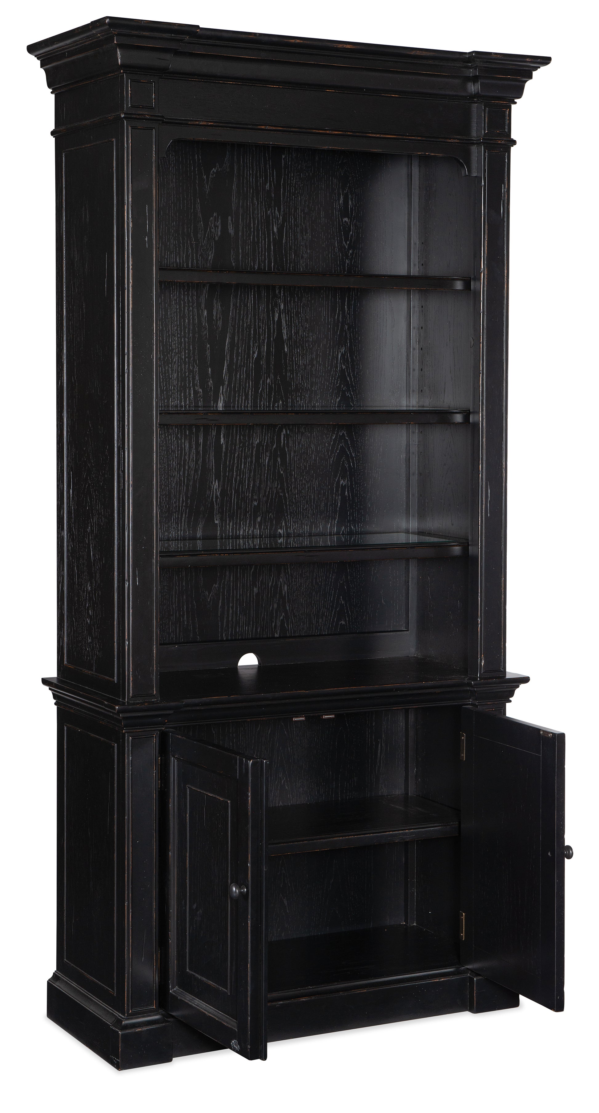 • Crafted of Pecan Veneers in a Tuxedo black paint finish with touches of warm brown, the bookcase has two doors with one adjustable shelf behind and 3 adjustable wood shelves