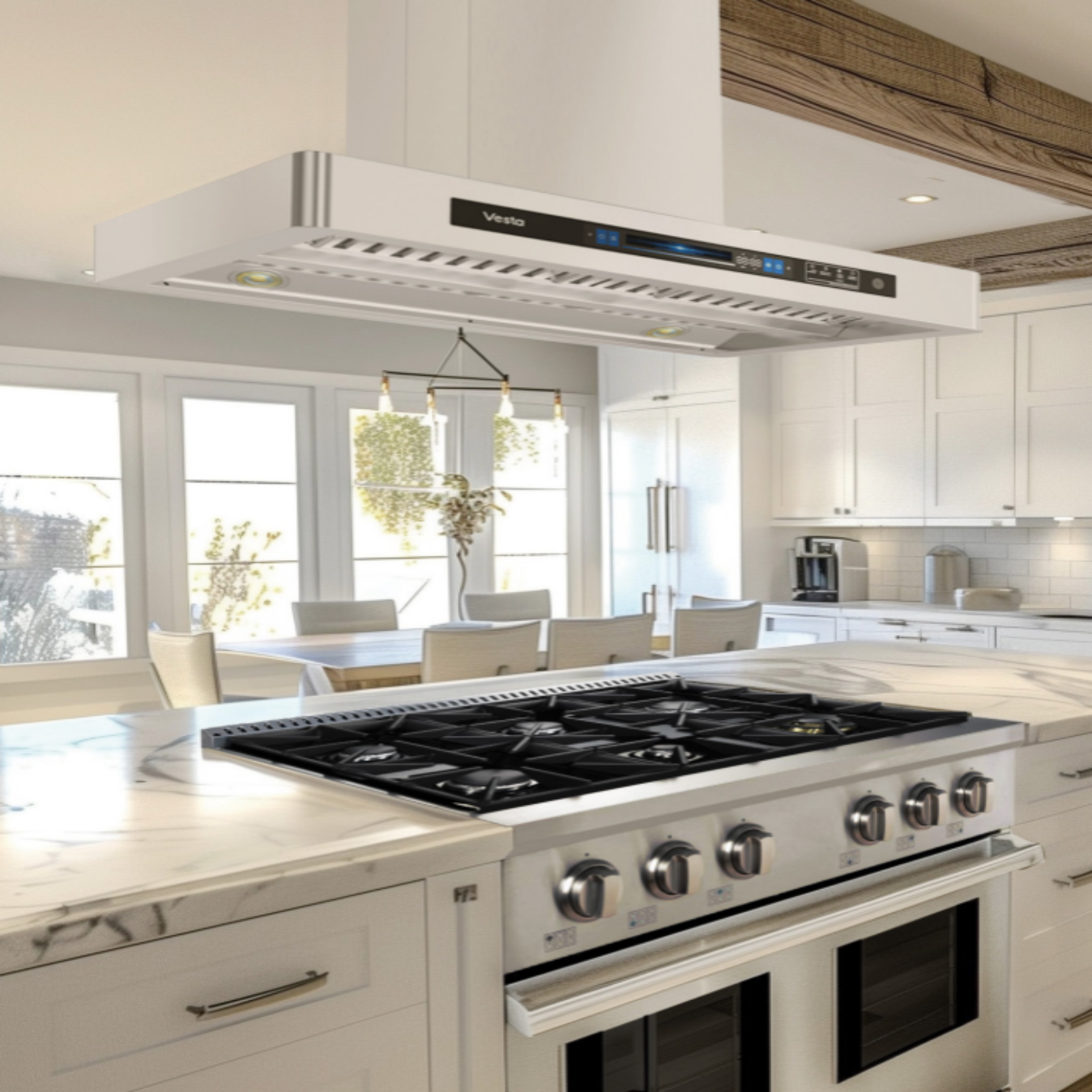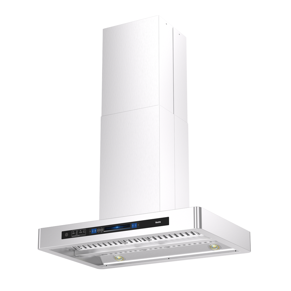 Vesta's Bucharest 36-inch stainless steel island range hood is a durable companion for your kitchen. Featuring a powerful DC motor, voice control, baffle filters, a sleek glass canopy, and Four LED lights, this unit will elevate your cooking experience to new heights. Here?€?s what makes it exceptional: