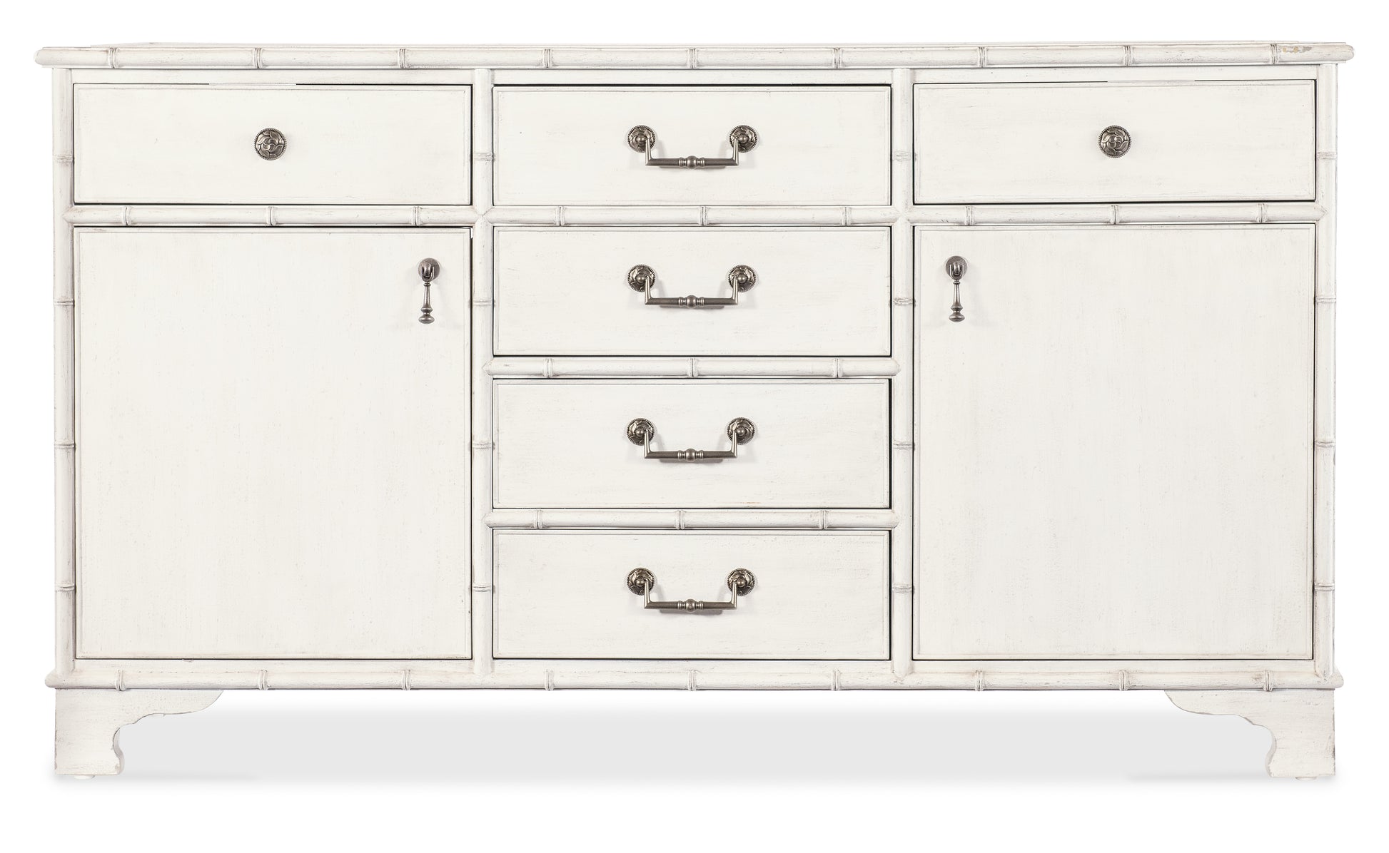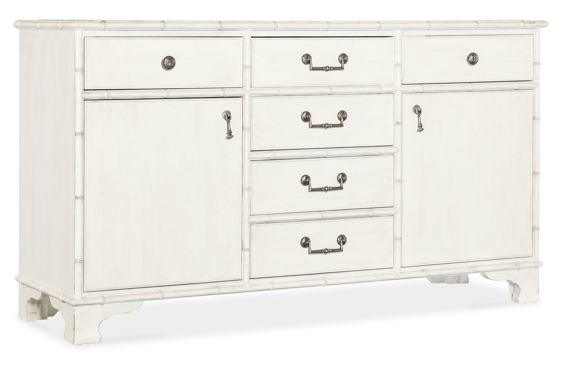 • Capturing the vintage charm of the coastal South and the tropical craftsmanship of the West Indies, the Charleston Bungalow Buffet is crafted of wood and resin with a Solid Wood Edge top and bamboo-motif accents
