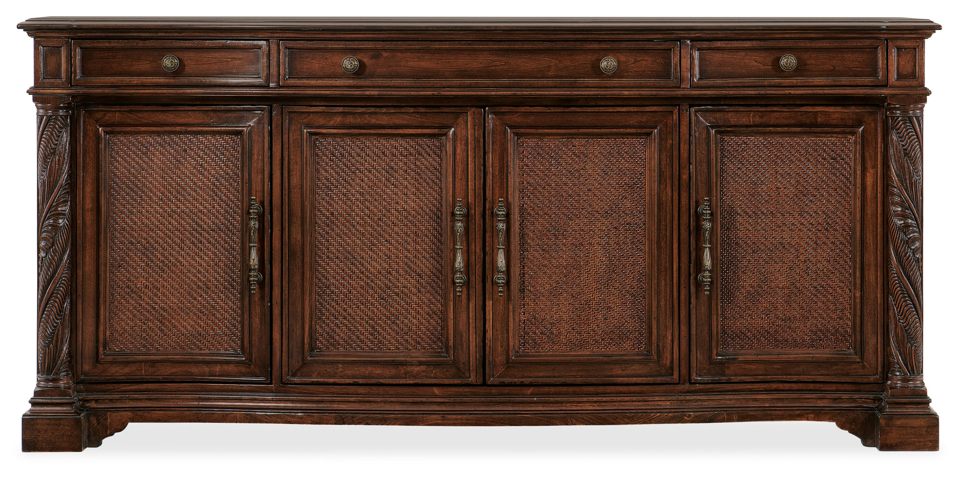 • Inspired by the tropical craftsmanship of the West Indies and the woven cane accents of classic British and Dutch Colonial design, the Charleston buffet has four doors with cane fronts and intricately-carved botanical motifs on the end posts