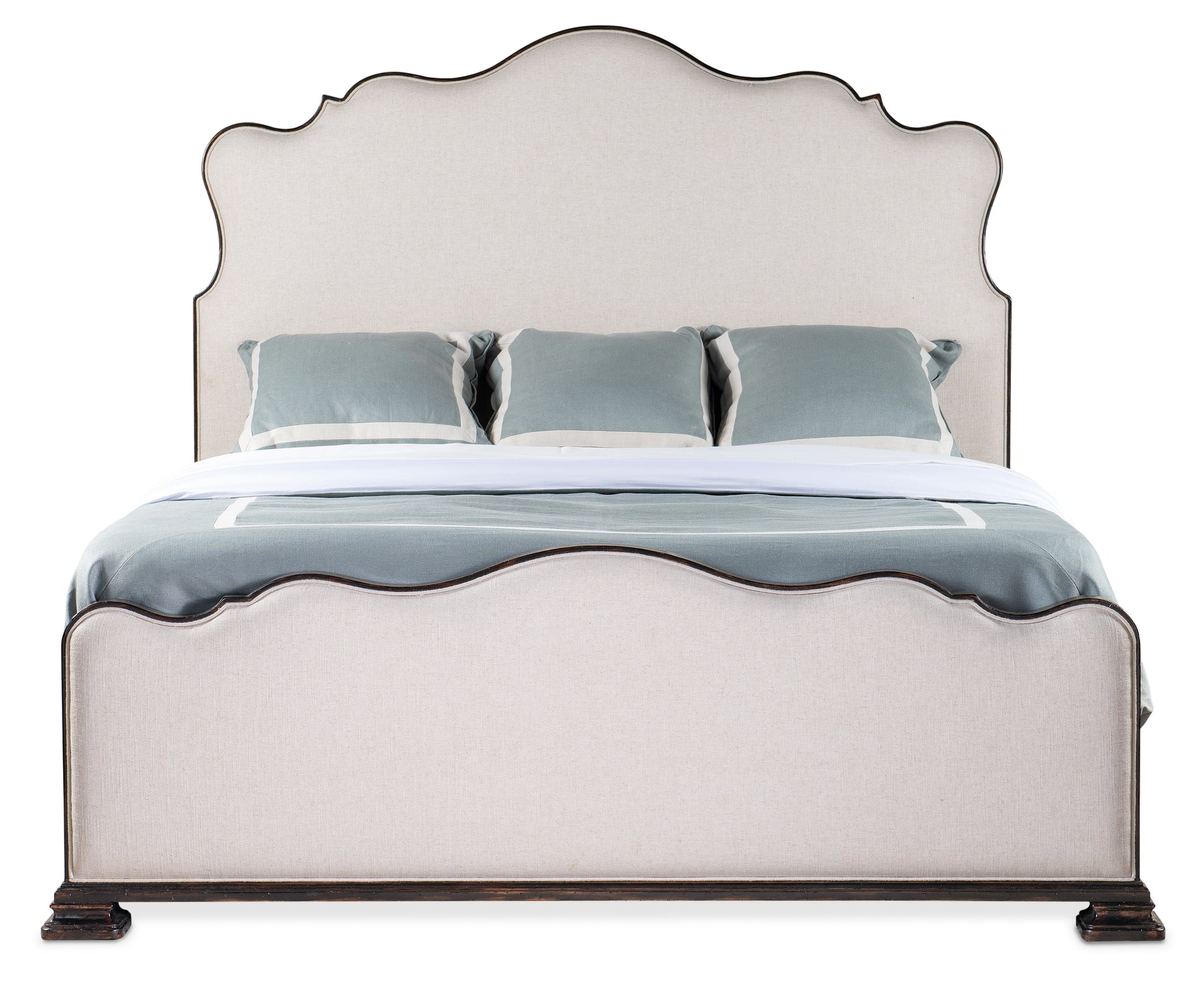 • Contrasting the rich Black Cherry heirloom finish on the wood trim, side panels and feet with the Chateau Linen upholstery on the scalloped-edge headboard and footboard, the bed is crafted of Cherry Veneers and fabric