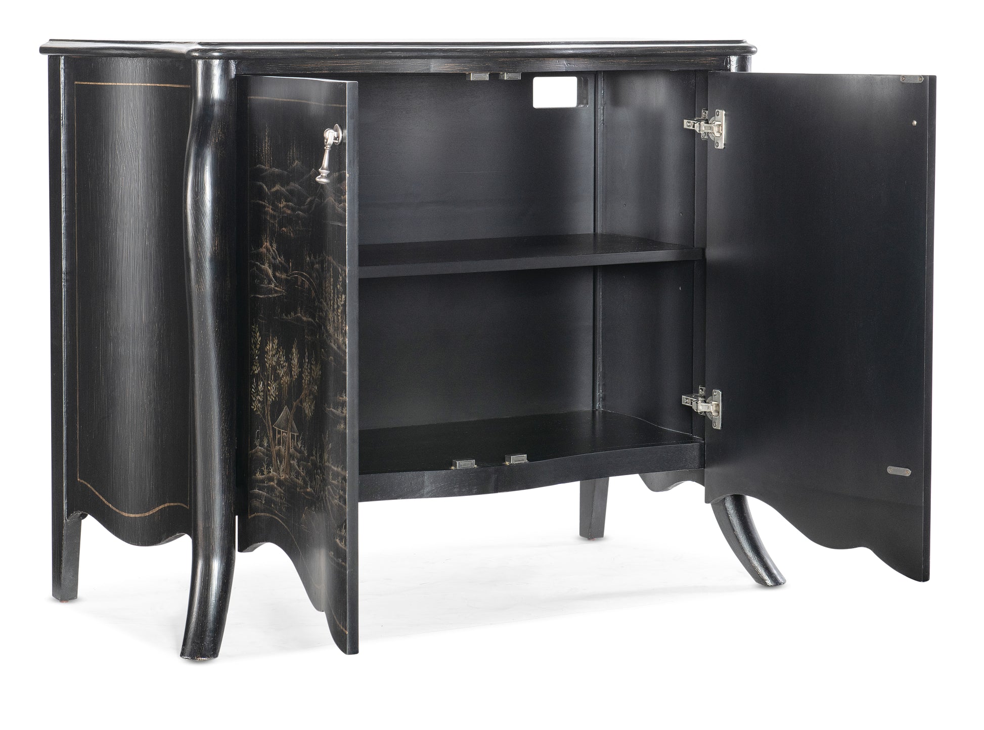 • Capturing a tropical vintage vibe, the Charleston Two-Door Chest has a scalloped apron and is finished in Black Water, featuring handpainted chinoiserie inspired by the confluence of culture throughout the southeastern region