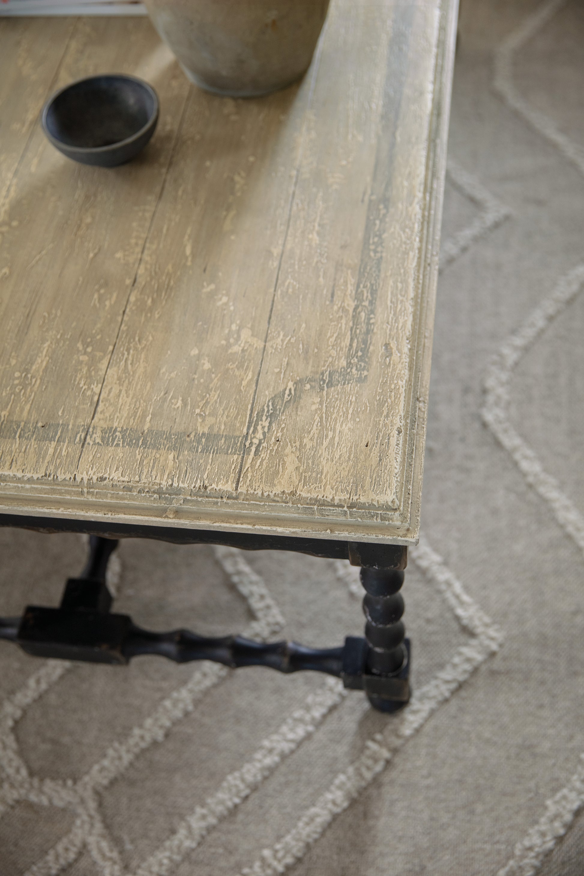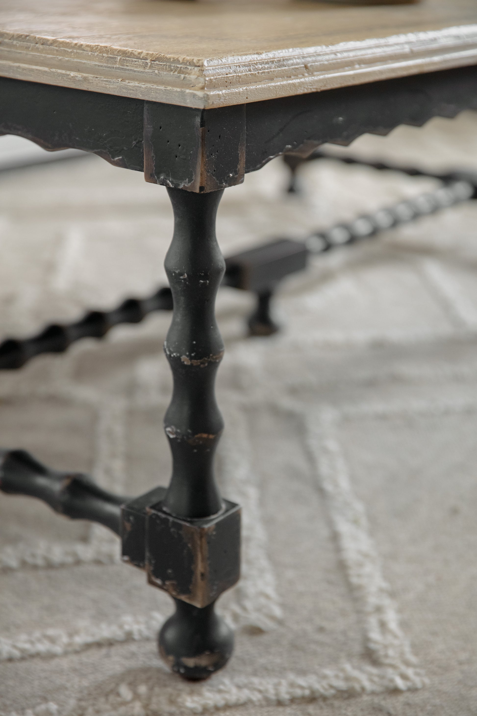 • Elegant vintage turned spindle legs in black contrast with a Flaky White-finished top for a look that is farmhouse fresh and inviting