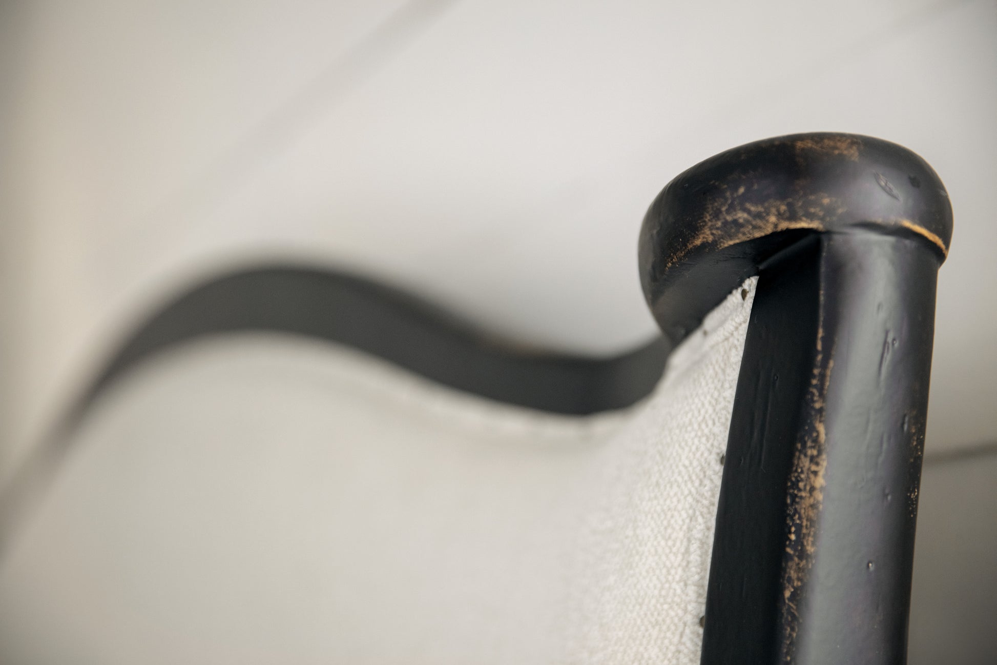 • The creamy Tuscan White upholstered headboard and footboard are framed in Poplar Solids finished in a hand-chiseled exquisite black color and trimmed in intricate tack nailheads