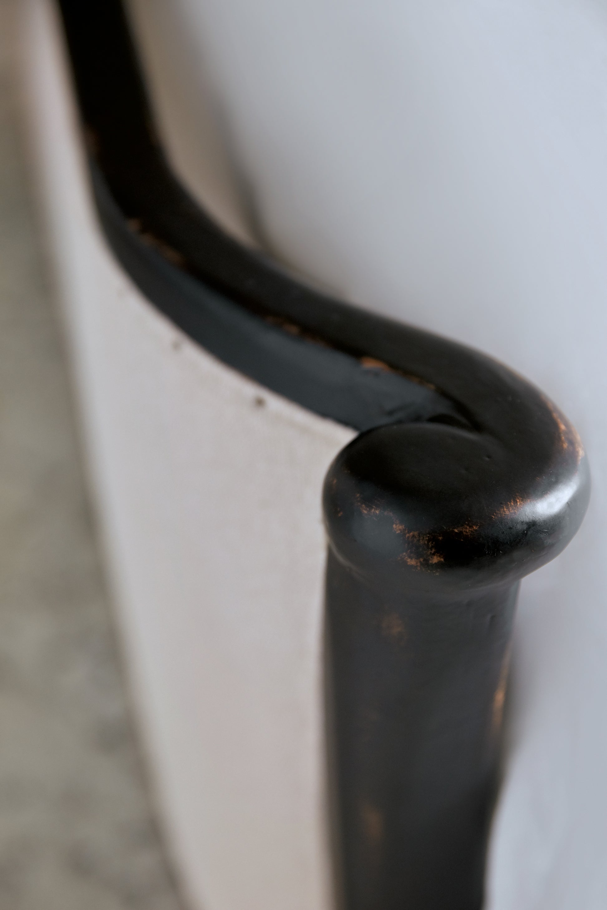 • The creamy Tuscan White upholstered headboard and footboard are framed in Poplar Solids finished in a hand-chiseled exquisite black color and trimmed in intricate tack nailheads