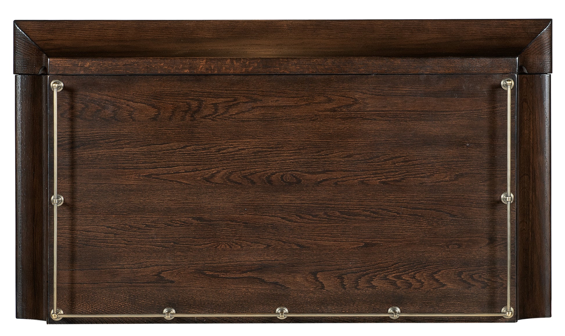 • Crafted of Elm Veneers with a rich dark finish, it has a gold metal gallery back on the top, two doors with magnetic catches and a scalloped apron around the bottom