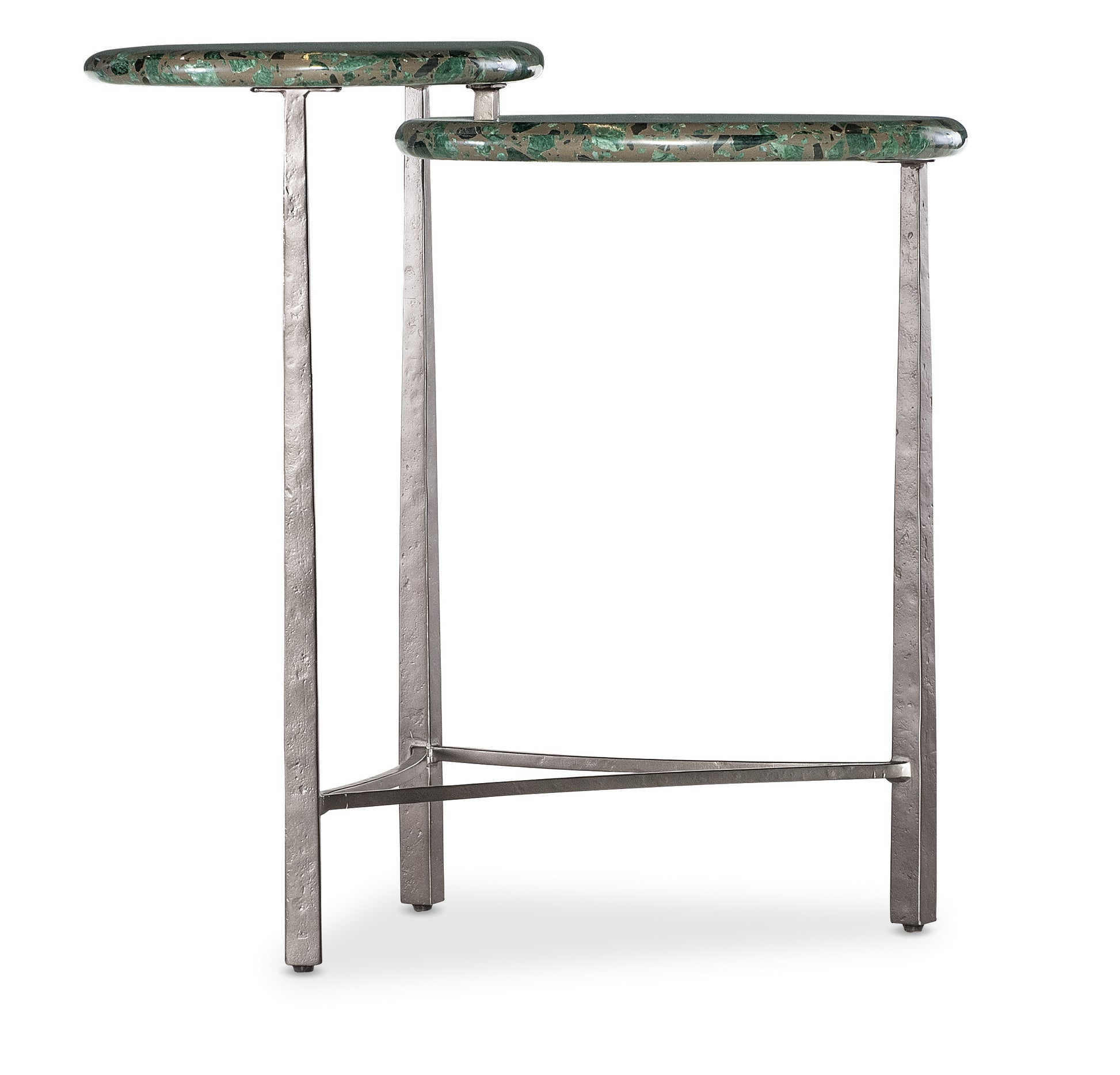 • The textured metal base is complemented by soap stone tops with flecks of green, black and charcoal
