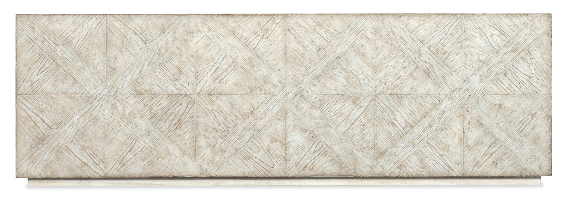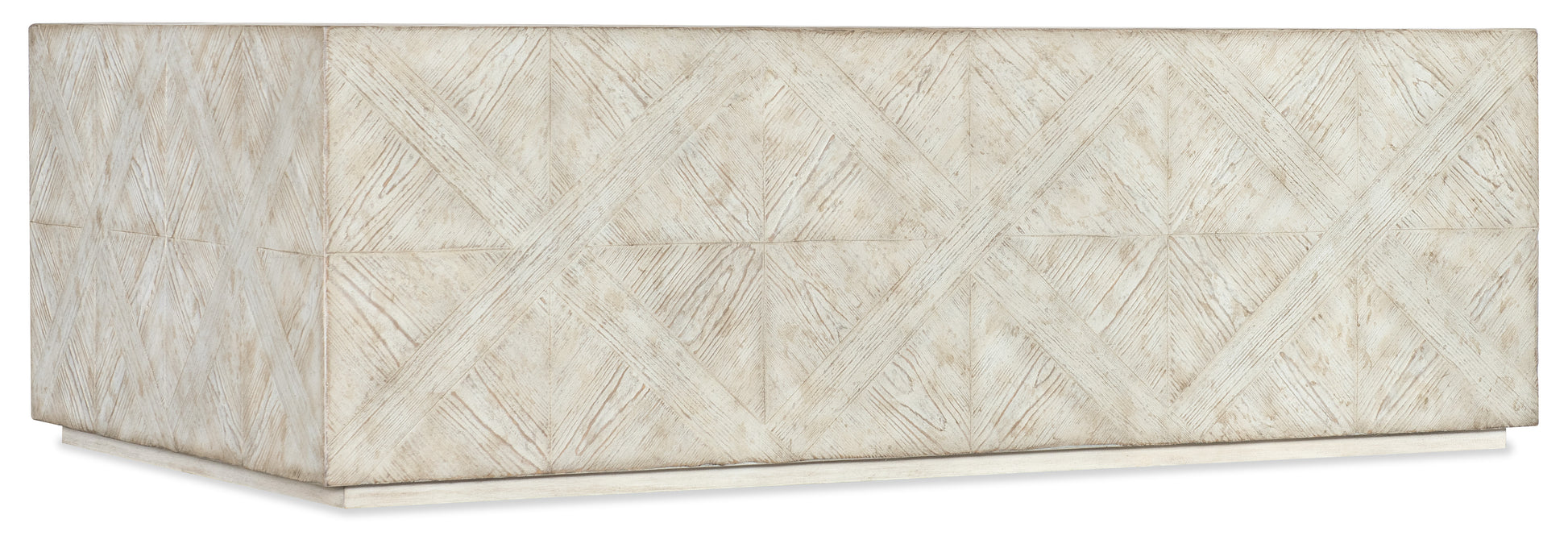 • In a 54W x 33D rectangle form, the Block Buster Cocktail Table is crafted of Pine with parquet-patterned veneers in a creamy white finish with rub-through and distressing and a plinth base.Targeting the next generation of furniture buyers, Hooker unveils the Commerce & Market brand of accent and occasional pieces