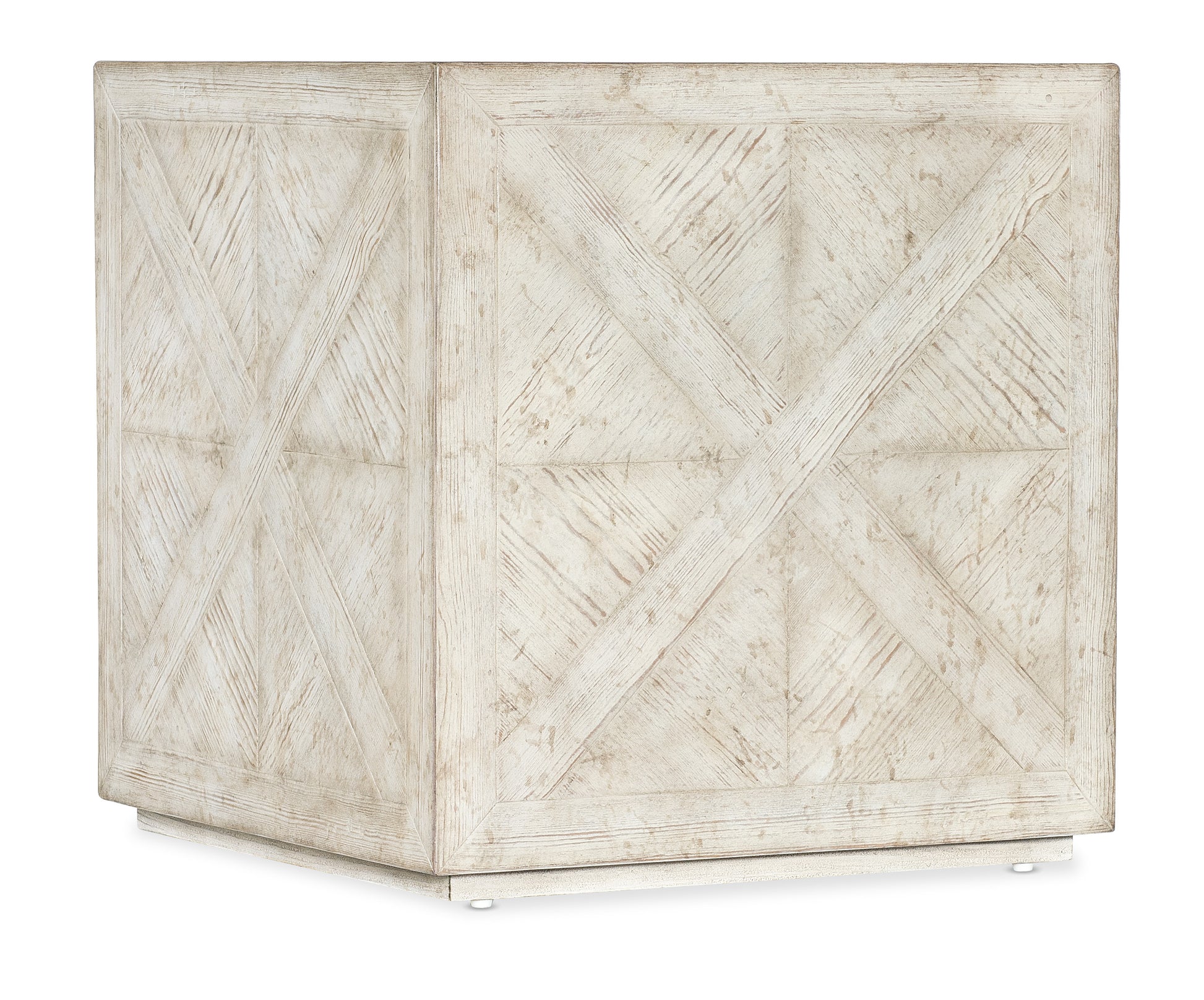 • In a cube-like form, the 24-inch square Block Buster End Table is crafted of Pine with parquet-patterned veneers in a creamy white finish with rub-through and distressing and a plinth base.Targeting the next generation of furniture buyers, Hooker unveils the Commerce & Market brand of accent and occasional pieces
