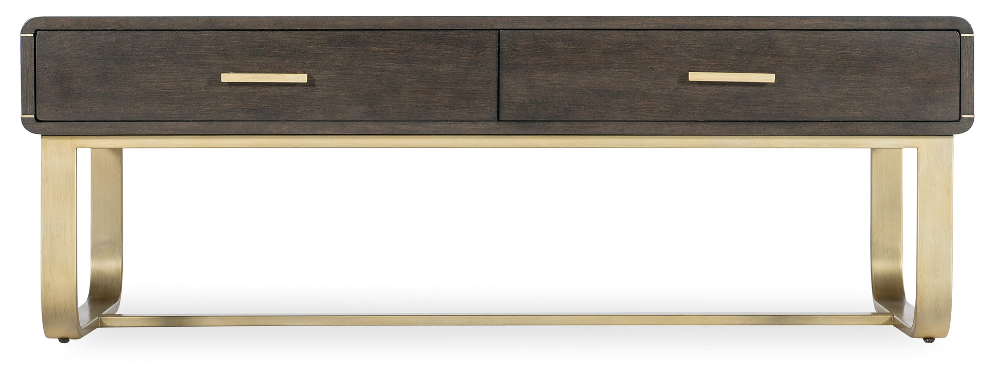 • The Metropolitan Cocktail Table is a soft modern silhouette combining Oak Veneers in a dark wood finish with a rounded gold metal base and accents