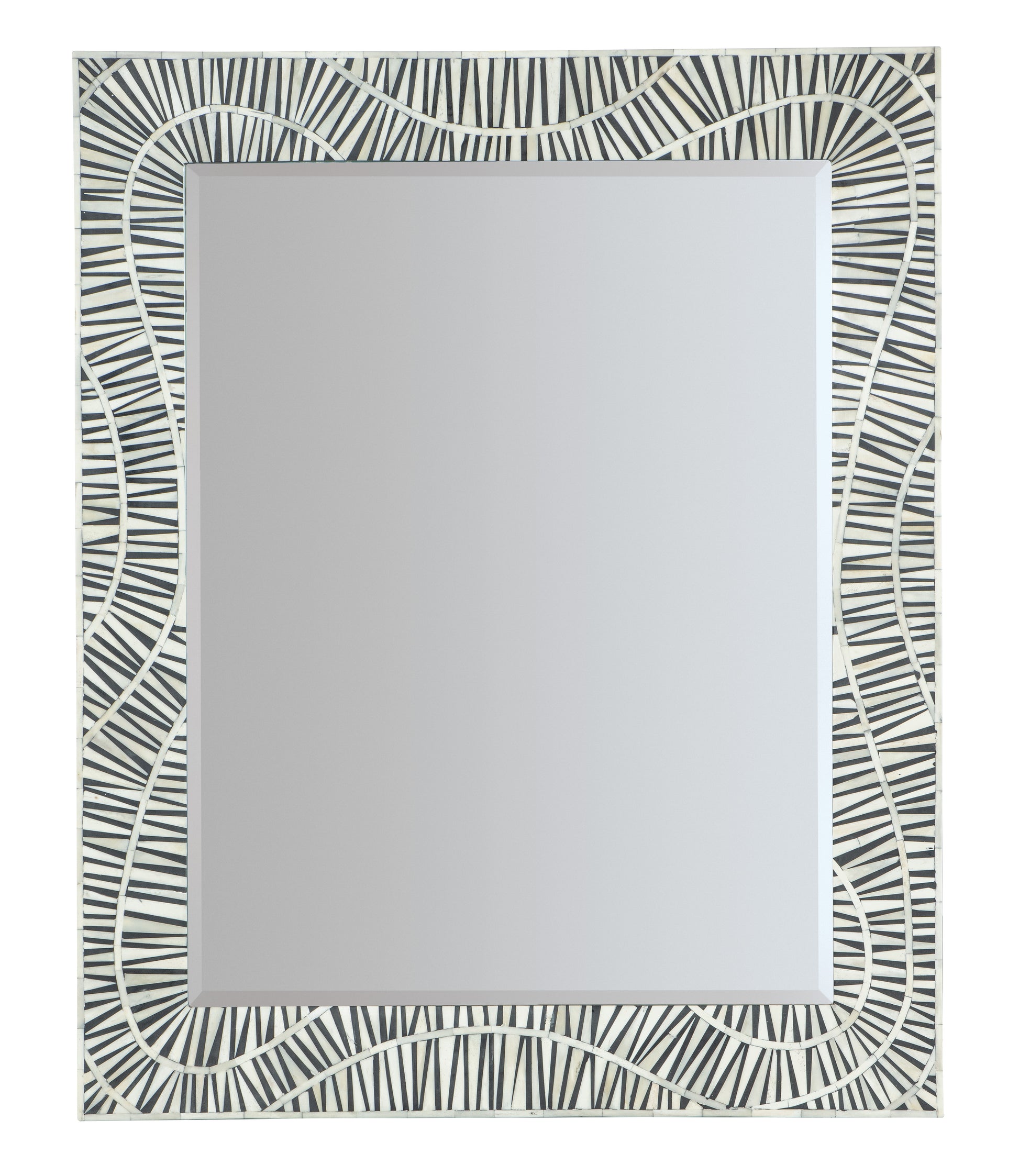 • With a tribal and primitive vibe, the Tiger Tooth Beveled Vertical Mirror has a black and white design and is crafted of Mango Solids, Bone and glass