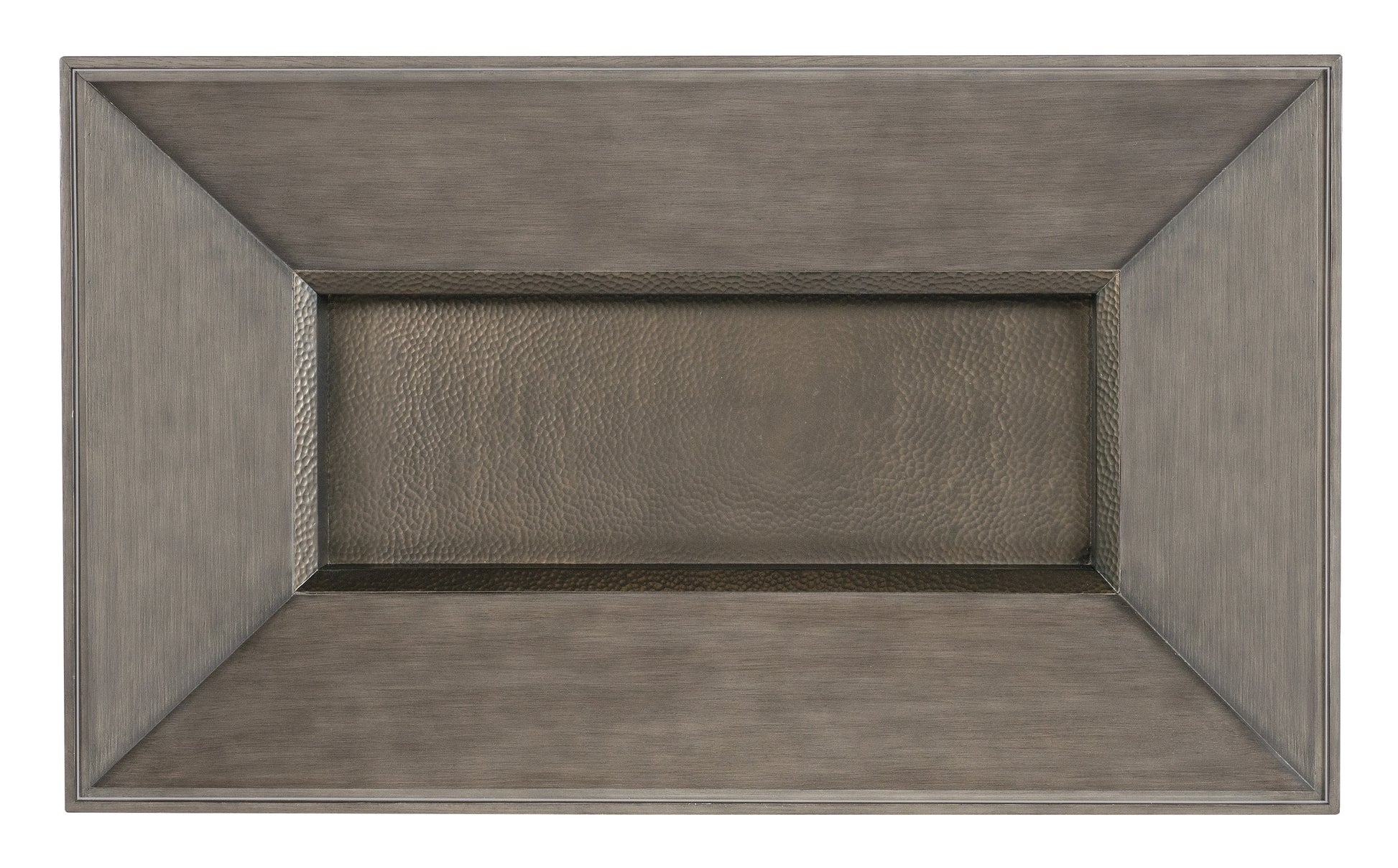 • An intriguing mixture of shape, materials and color, the rectangle-shaped Travelers Cocktail Table has a concave design under glass with hammered metal inset