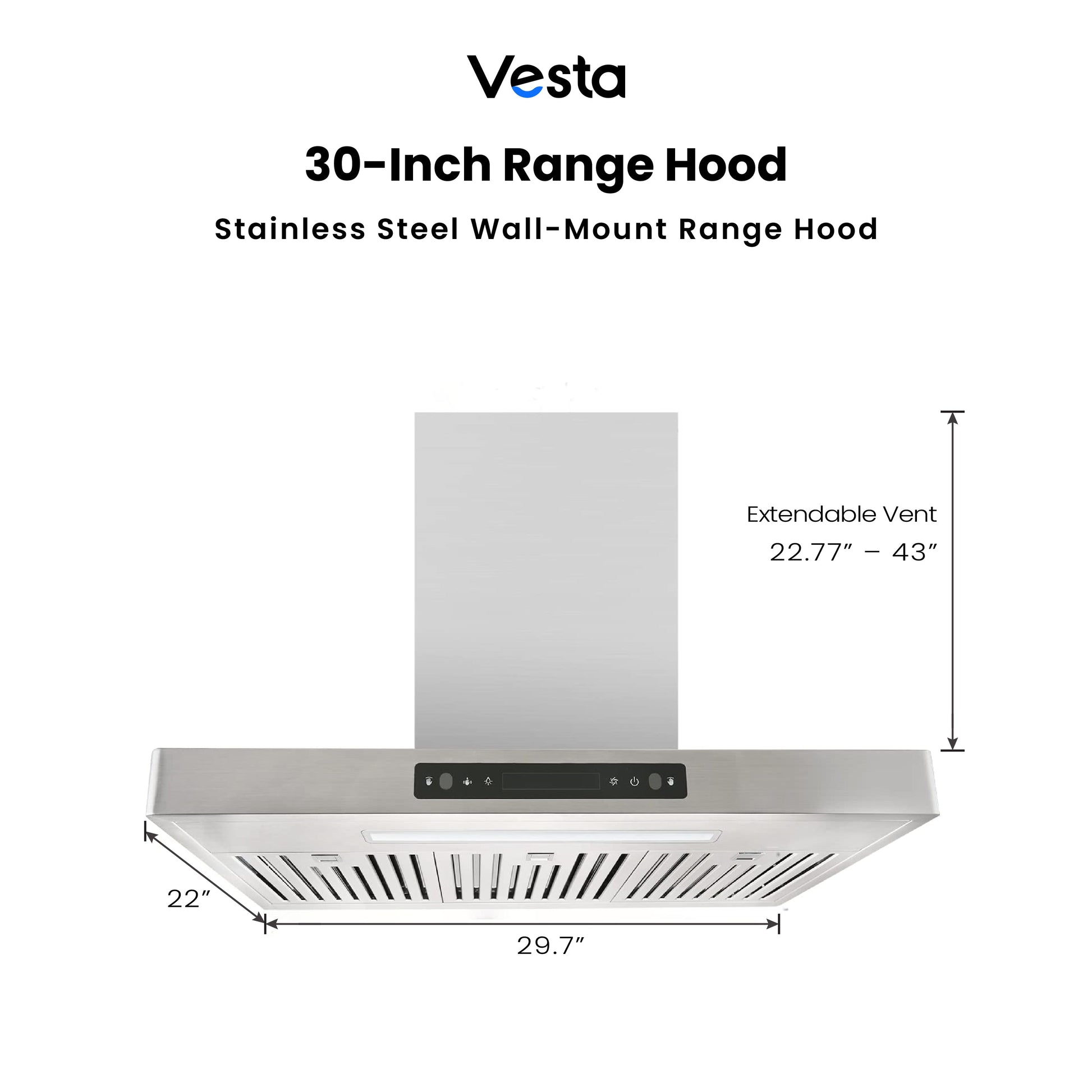 Vesta's Copenhagen 24-inch stainless steel wall-mounted range hood is a durable companion for your kitchen. Featuring an ultra strong motor, a touchscreen panel, two baffle filters, and an LED light, this unit will elevate your cooking experience to new heights.