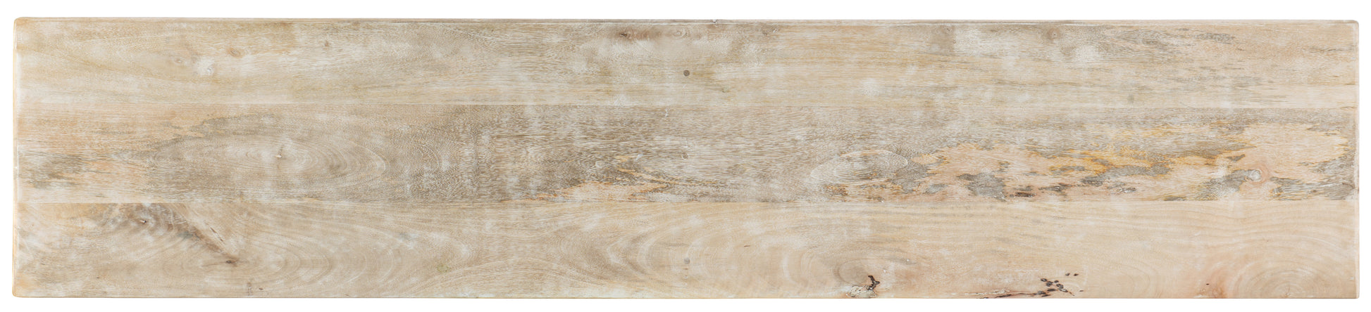 • A sleek form is complemented by a soft and soothing whitewash wood finish, accented by a gray metal base and textured oval hardware on the Door Entertainment Console