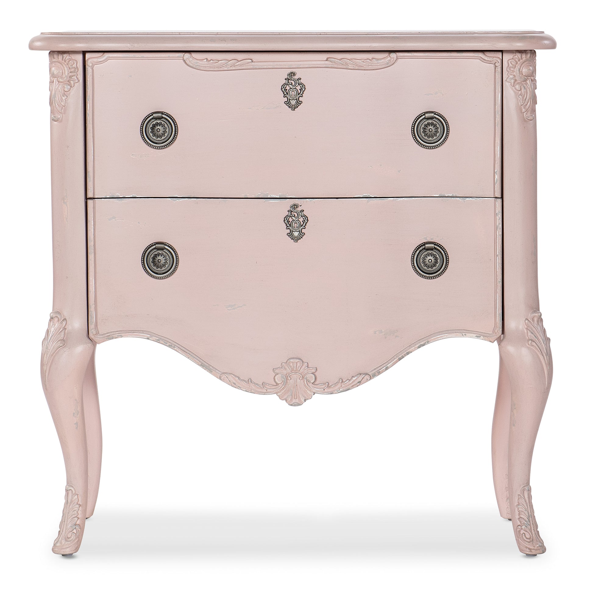• Part of a curated collection to honor the journeys of those affected by breast cancer, the light distressed pink finish of the chest is accented by satin nickel decorative ring pulls and faux lock backplates, and the two drawers have pink interiors