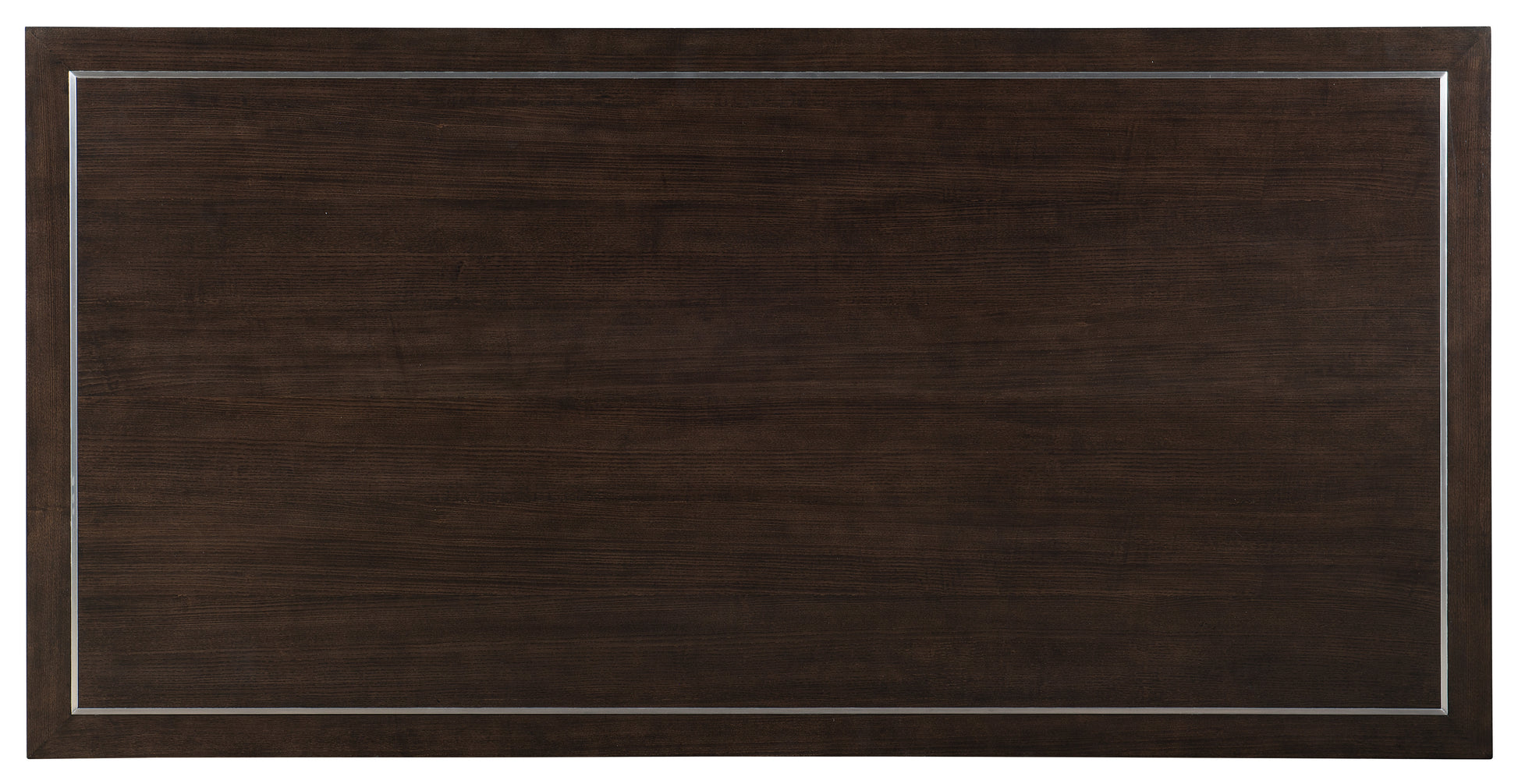 • Add stylish work-from-home bandwidth to any space with the House Blend Executive Desk with a sleek combination of the Dark Roast finish over Quartered Ash Veneers, silver metal trim and polished stainless bar pulls