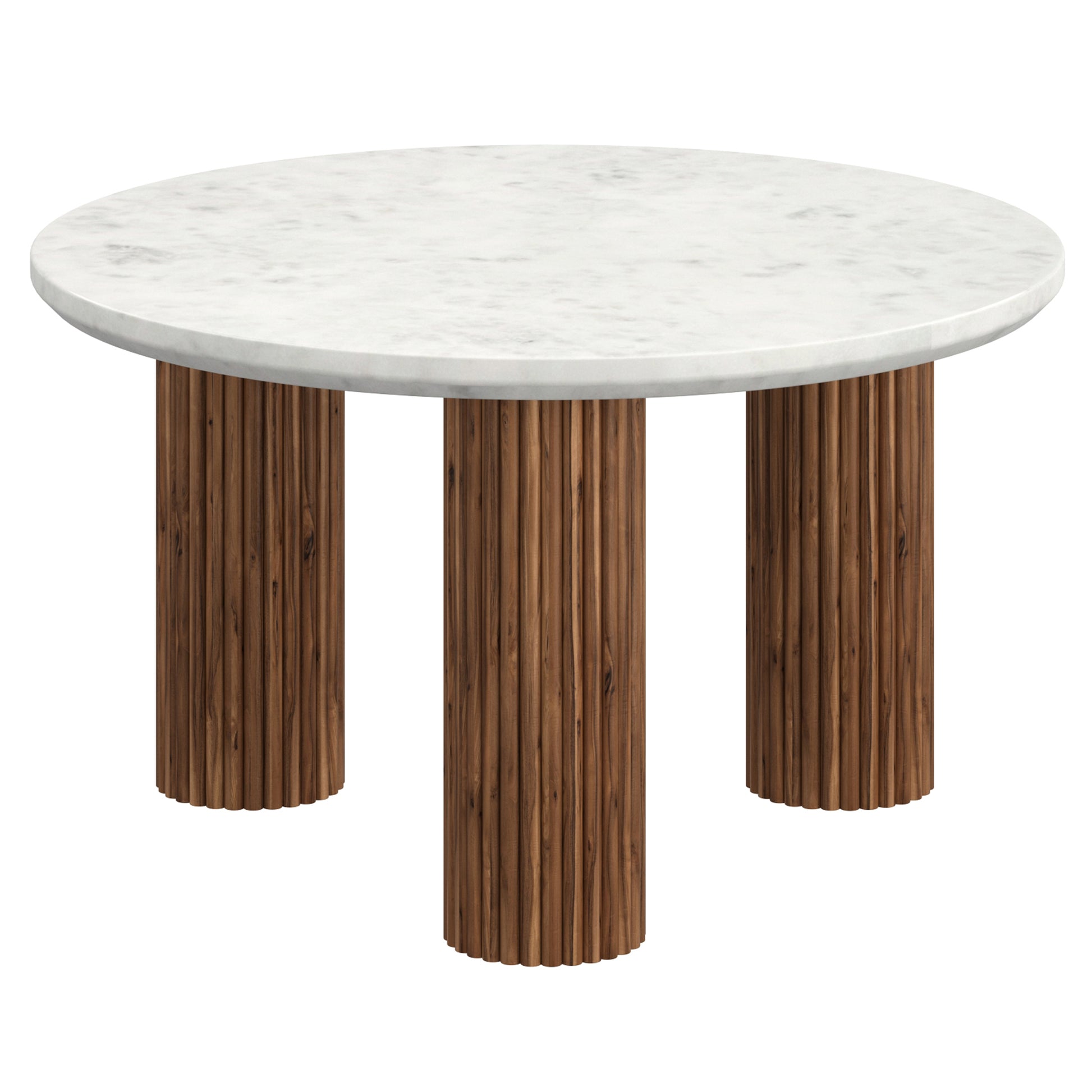 • Triple pedestal solid mango wood reeded base in a walnut finish