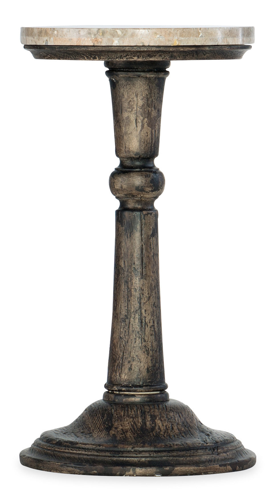 • A perfect perch for refreshment at the end of a tiring day, the Rabbs Prairie Martini Table contrasts a shaped base finished in a dark Flemish paint with a stone top for an eclectic look