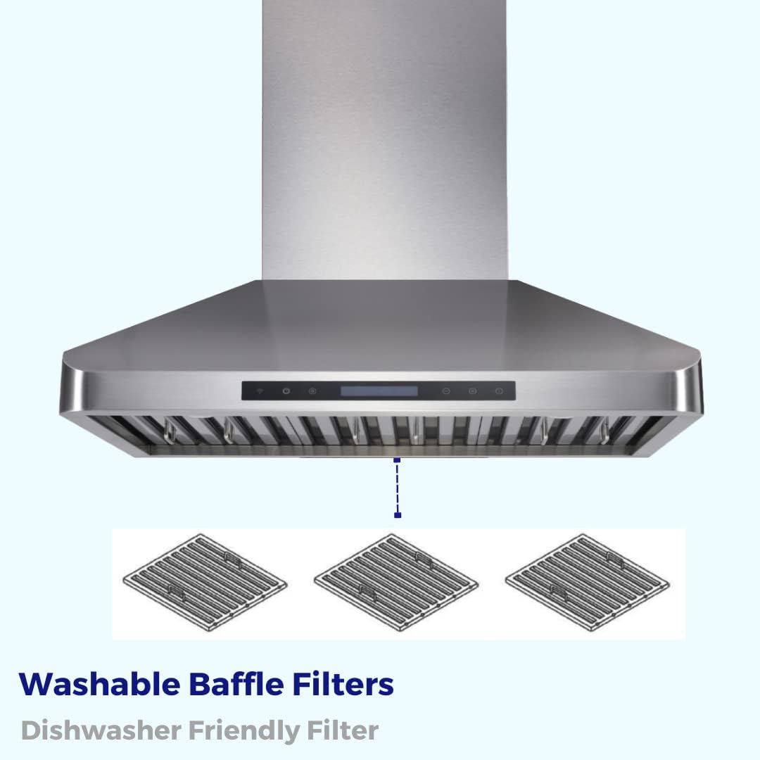 Vesta's London 30" stainless steel wall-mounted range hood is a durable companion for your kitchen. Featuring an ultra strong motor, a touchscreen panel, two baffle filters, and two LED lights, this unit will take your cooking experience to a new level.