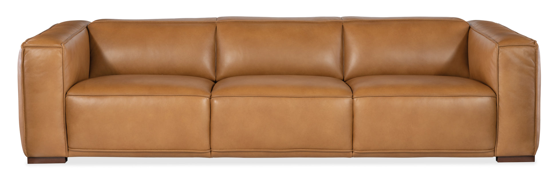 • A sleek, low-profile silhouette with wide track arms, wood block feet and flange welt trim are paired with a warm and inviting caramel-colored luxurious semi-aniline leather cover in the 114-inch-wide Maria 3-seat Sofa.Hooker Upholstery is a designer-inspired collection of upscale leather seating that includes versatile reclining chairs, modern-day reclining sofas, eclectic club and artisan accent chairs, as well as a selection of executive desk chairs for the home