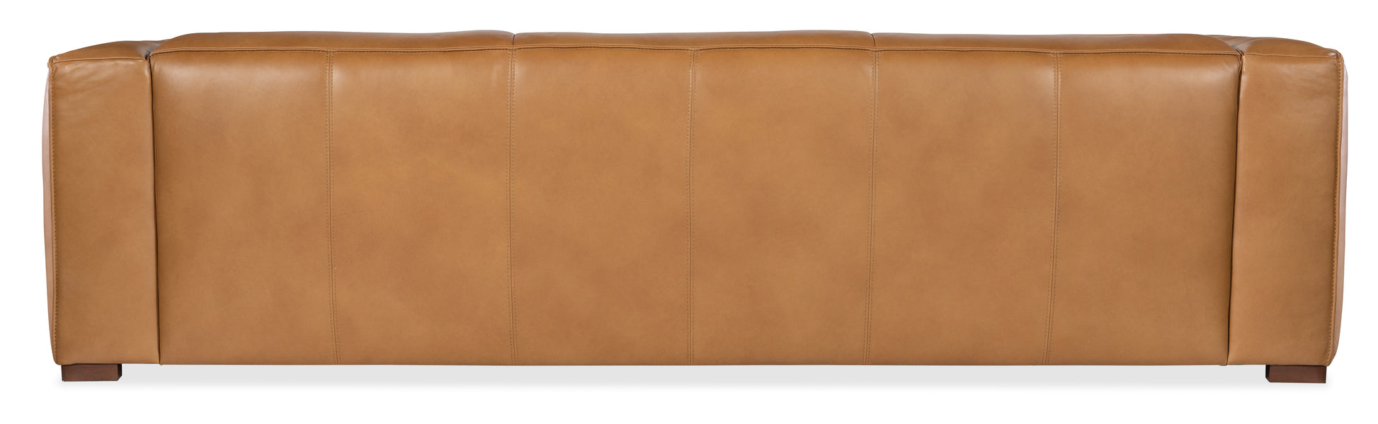 • A sleek, low-profile silhouette with wide track arms, wood block feet and flange welt trim are paired with a warm and inviting caramel-colored luxurious semi-aniline leather cover in the 114-inch-wide Maria 3-seat Sofa