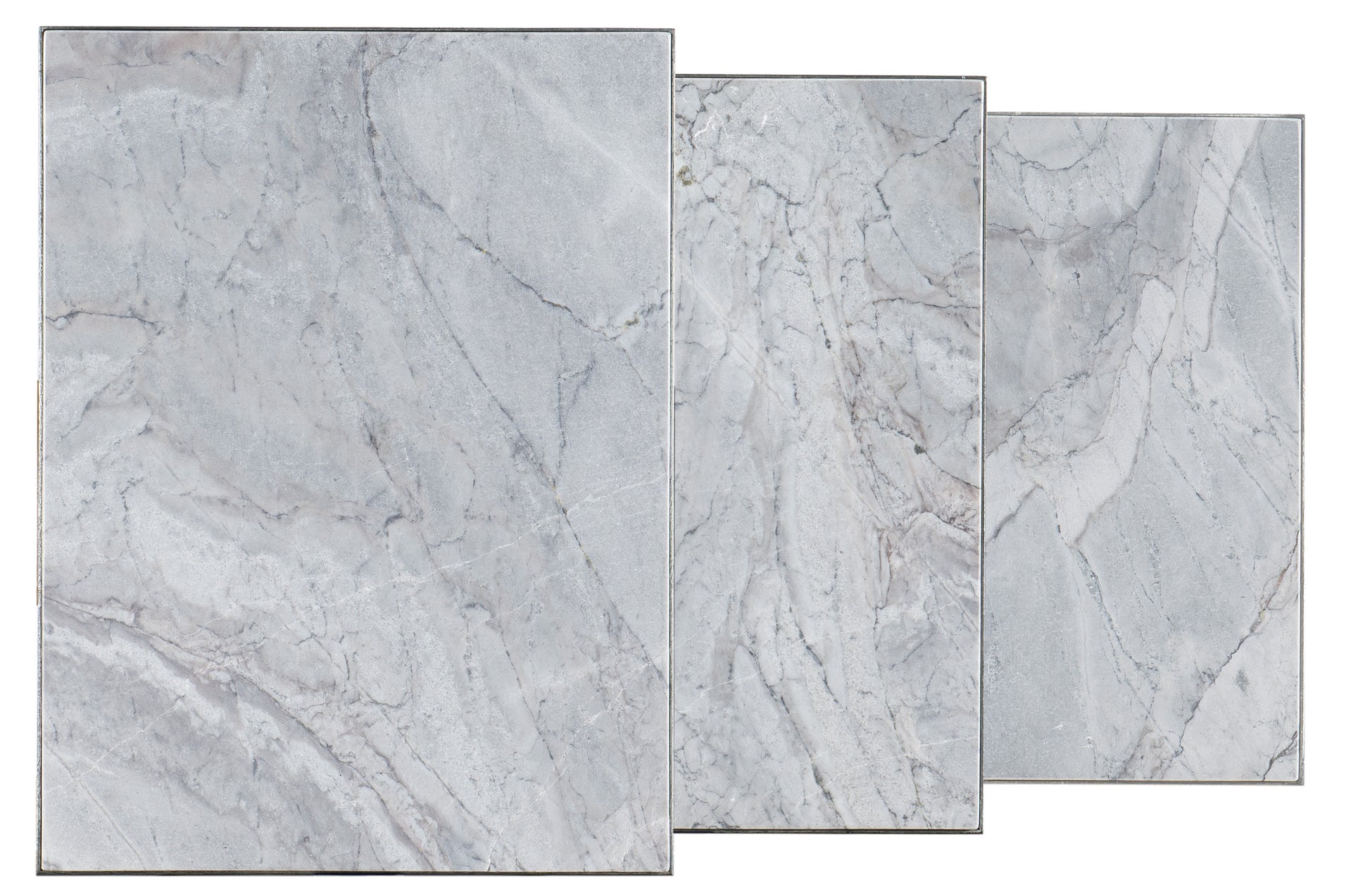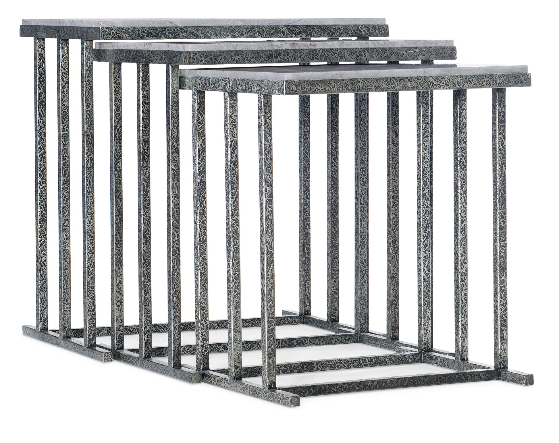 • With the look of metal tapestry, the set of three Bianca Nesting Tables have tactile and textural distressed gray metal bases and San Juan Slate stone tops.Come closer to Melange, and you will discover something unexpected