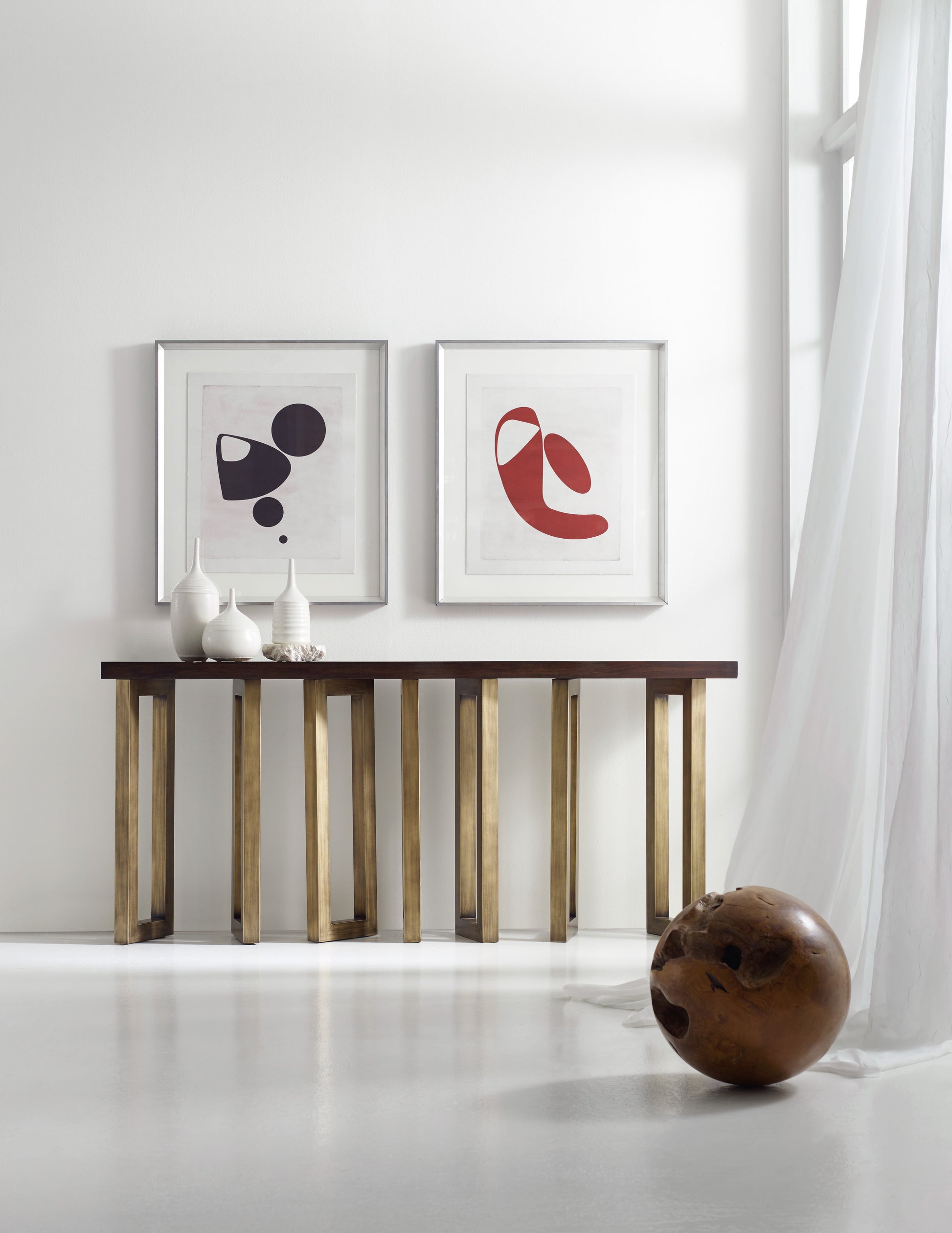 • An abstract art lover’s dream, the Connelly Hall Console has an organic beauty, combining a Cathedral Black Walnut Veneer top and a random-pattern metal base in a soft, earthy gold finish