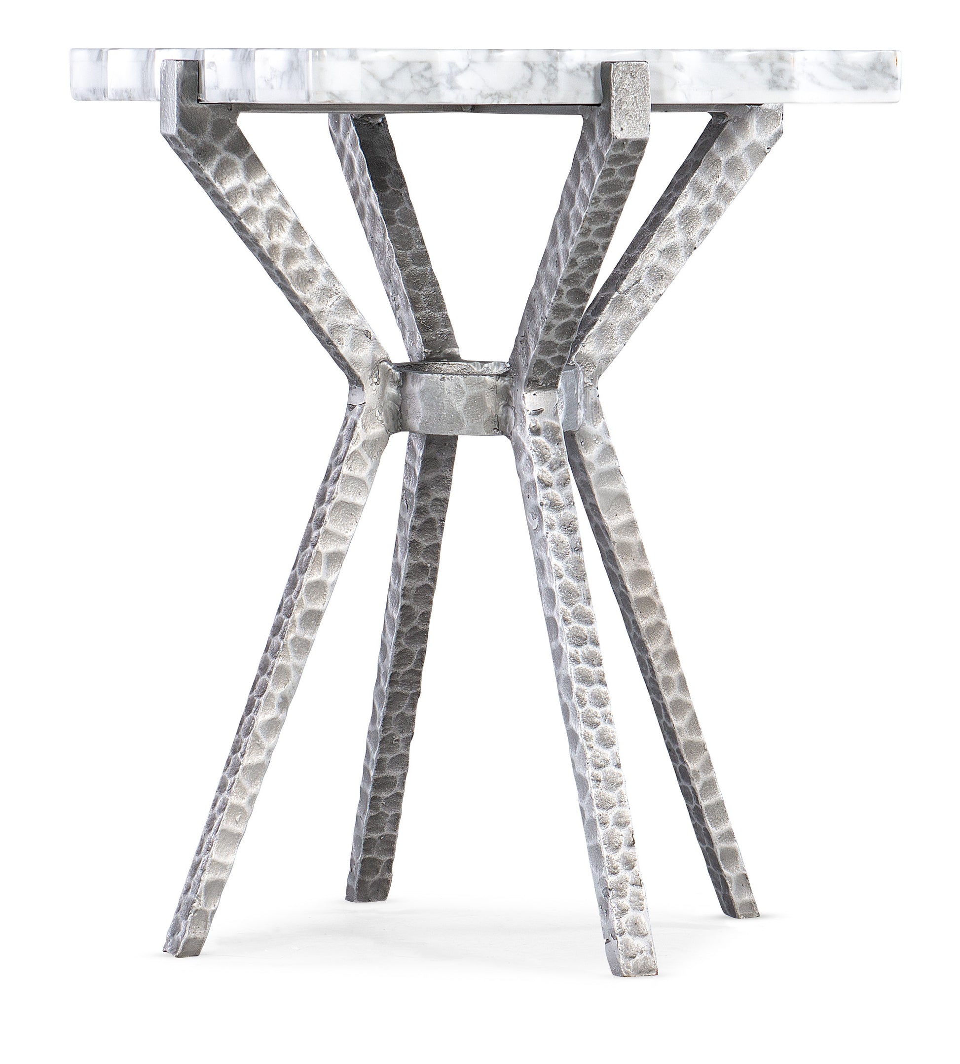• Industrial chic meets craftsman couture in the Glendon Side Table, combining a cast metal base in a silver distressed finish with a Carrara Marble Veneer top.Come closer to Melange, and you will discover something unexpected