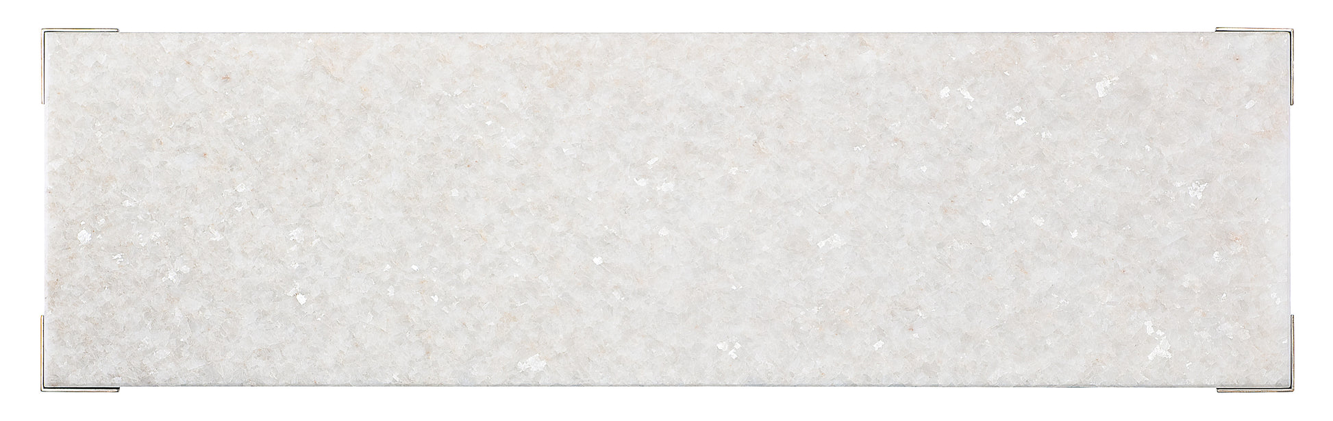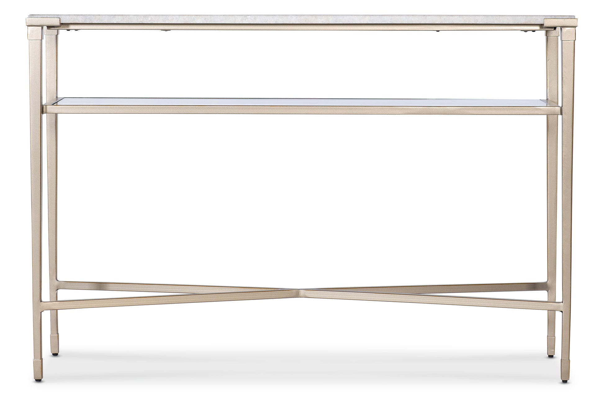 • Boasting a natural white stone top, slim champagne metal legs, and a clear glass shelf, this rectangular console table exudes modern elegance