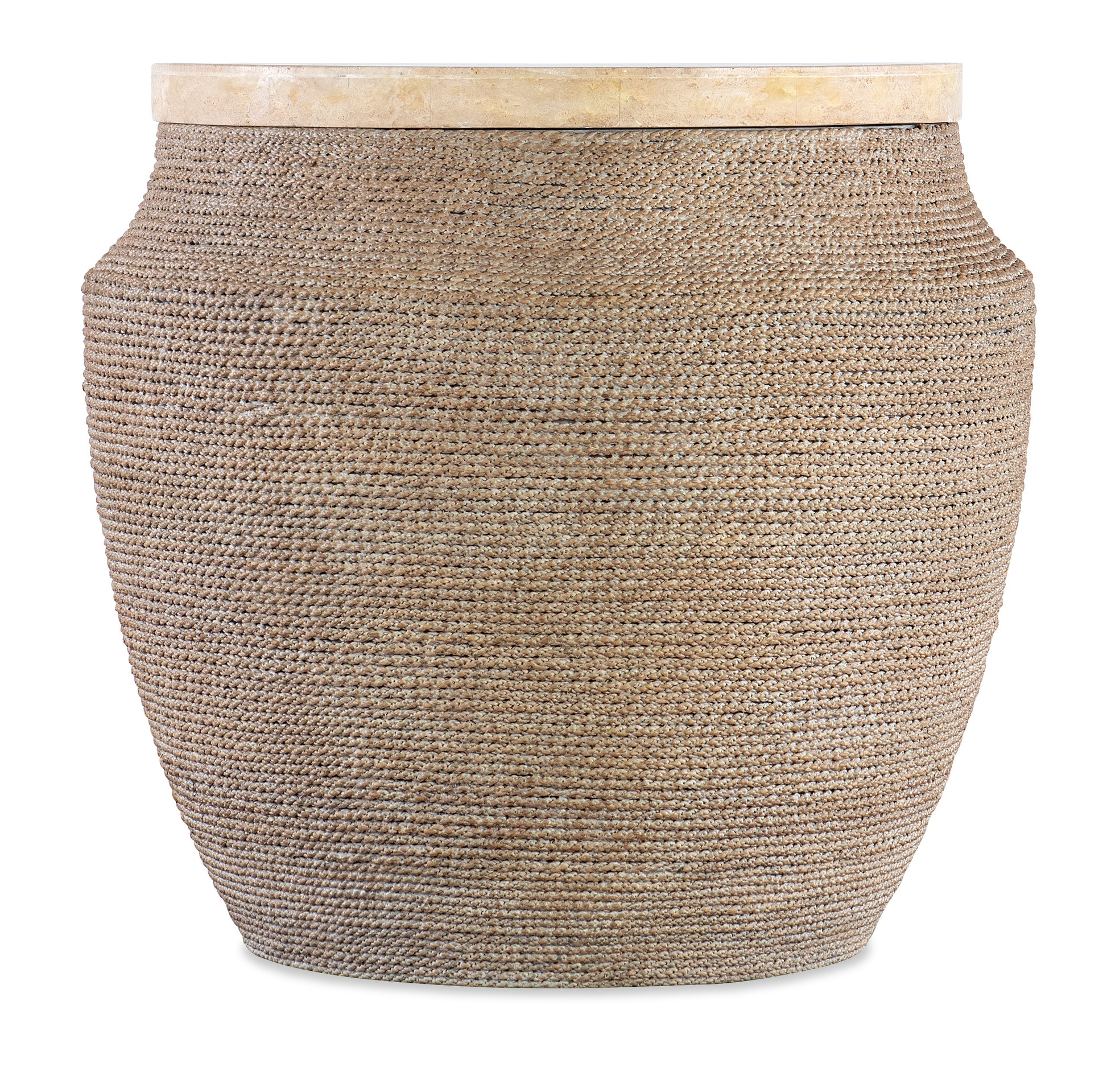 • Earthy, organic and chic, the Retreat Round Side Table is rope-wrapped with a Travertine Stone Veneer top
