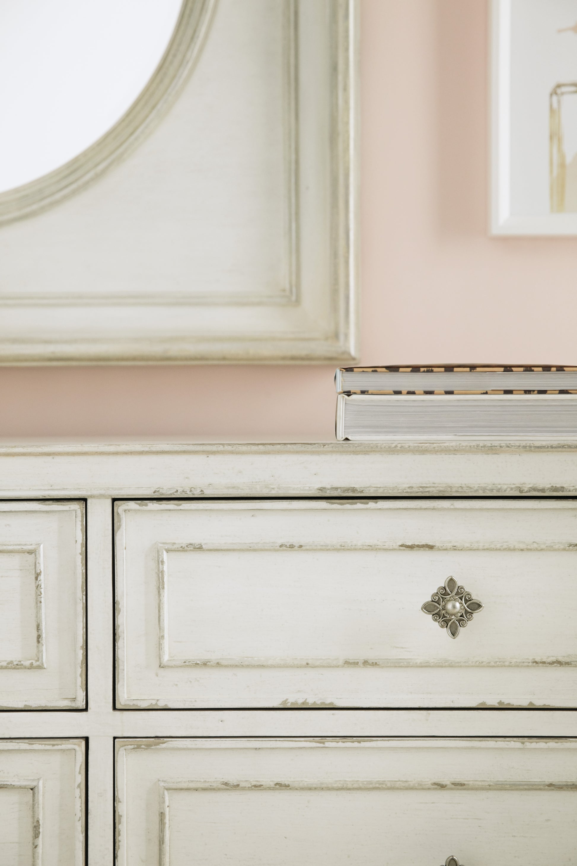 • As practical as it is pretty, the nine-drawer dresser has a top center drawer with a drop front and a right top drawer with a drop-in felt-lined jewelry tray