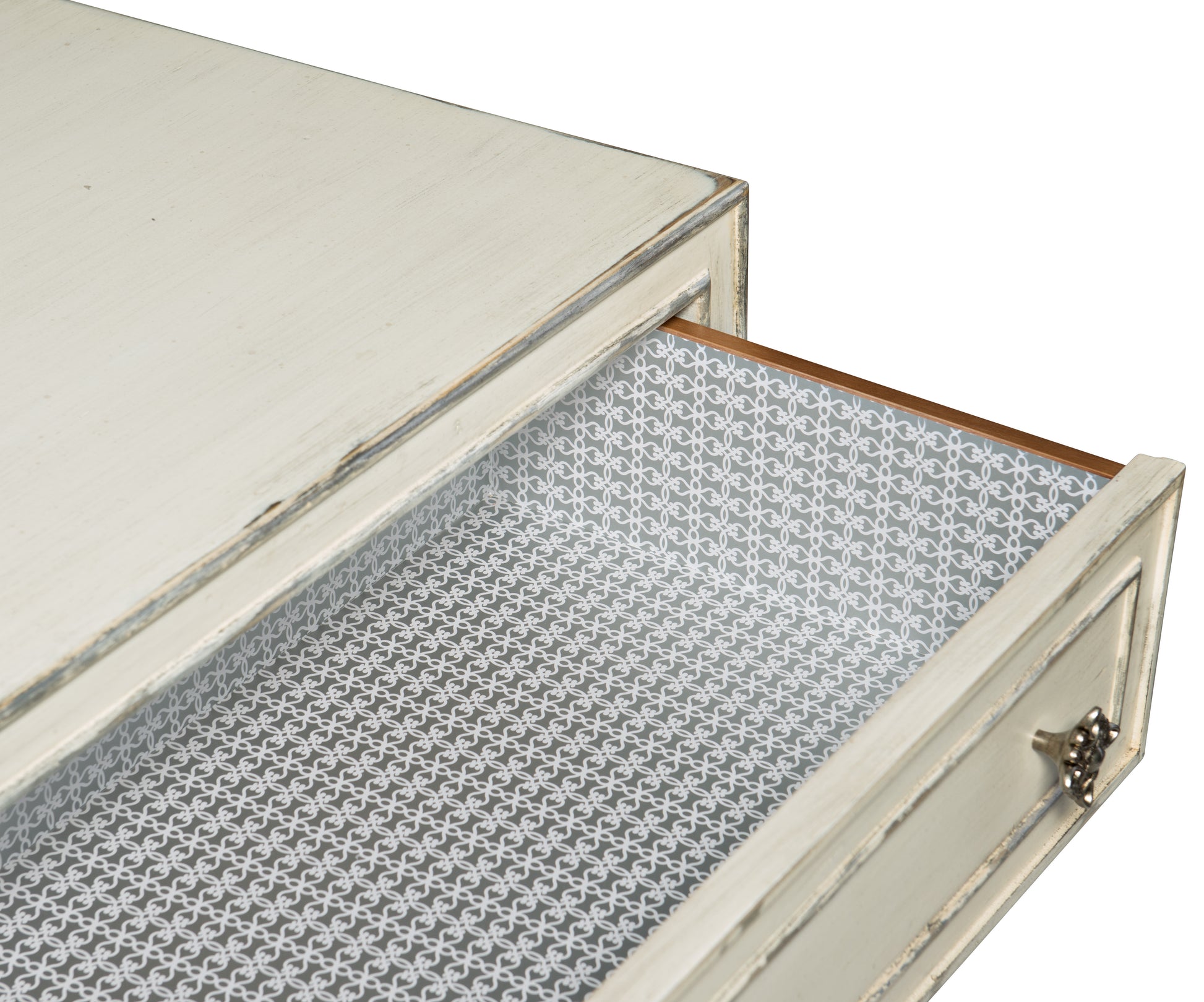 • The bottom 3 drawers are cedar-lined, and the top 3 drawers are lined with gray and white designer wallpaper