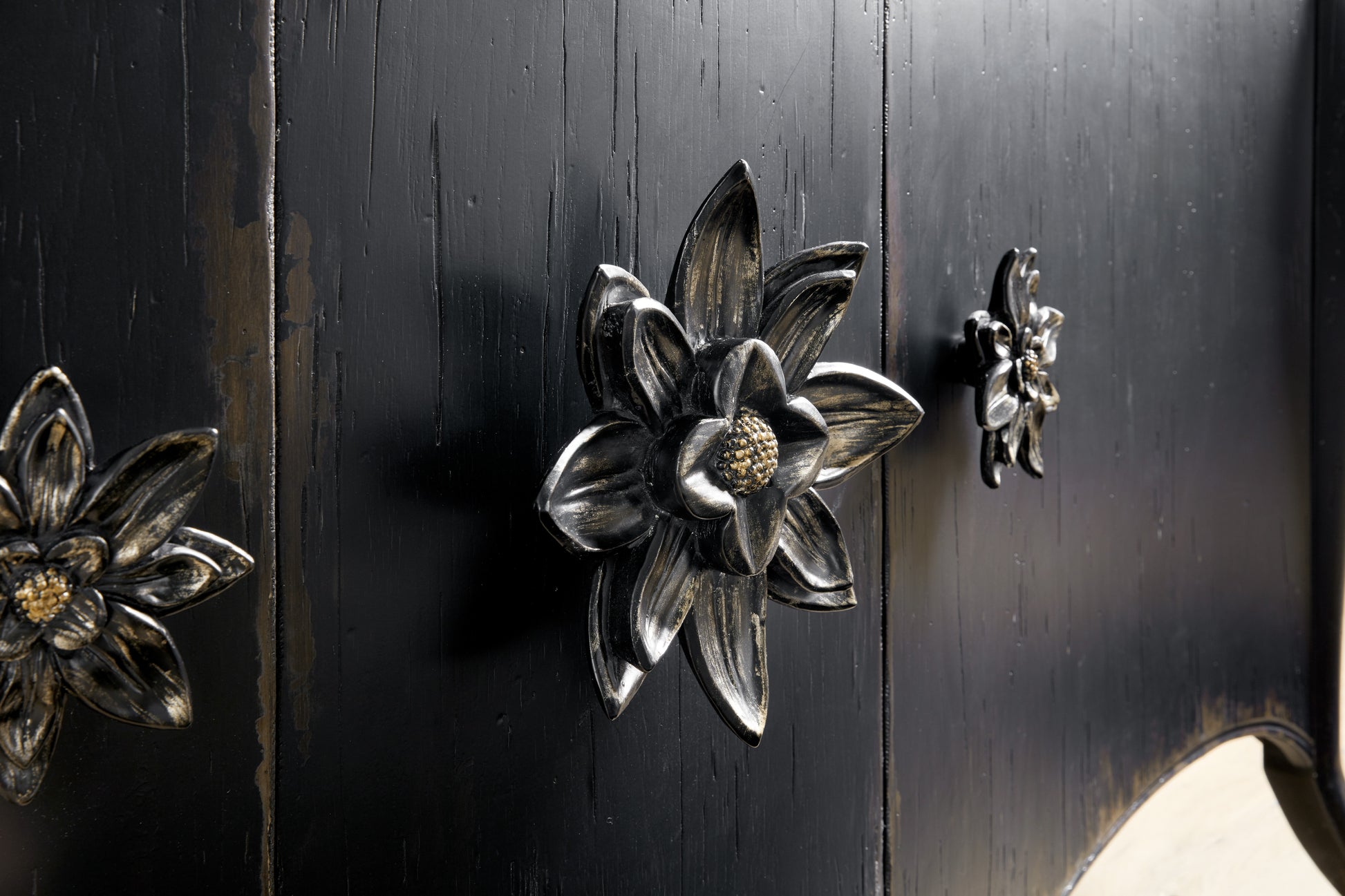 • Collette, a bold and dramatic look, is characterized by its dark black painted finish which serves as the perfect backdrop for intense pops of champagne, silver and gold, along with eglomise mirror details and dramatic floral carvings