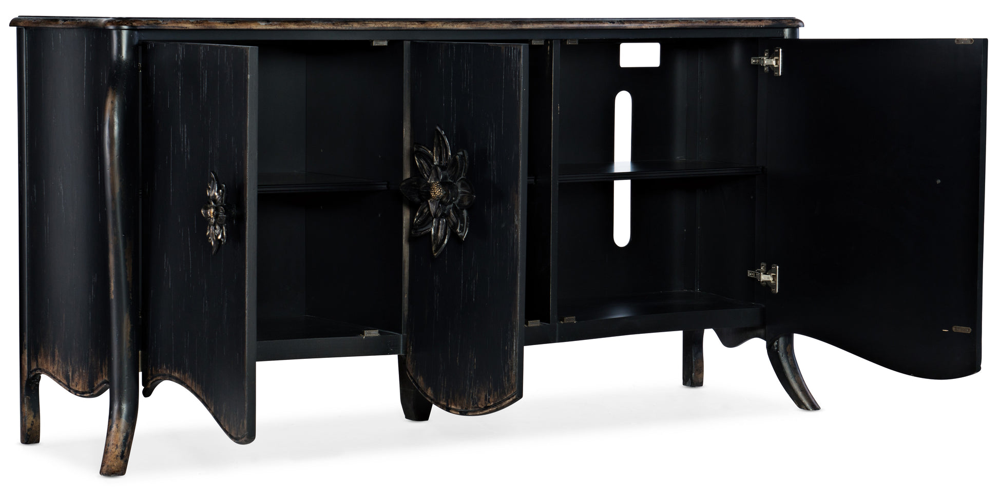 • With classic bones, the 3-door buffet features a shaped apron and cabriole legs and delightful decorative floral hardware