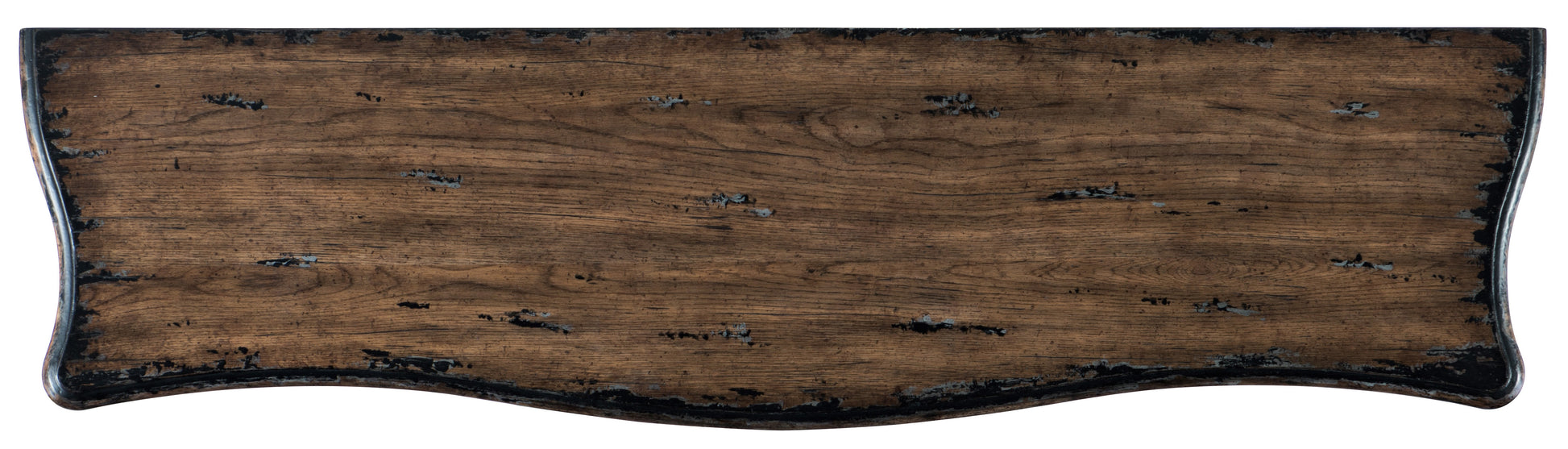 • Crafted of Poplar and Hardwood Solids with Oak Veneers, it is finished in Porte Noir, a black paint with rich brown undertones with areas of heavy rub through and distressing to reveal a honey tone wood color