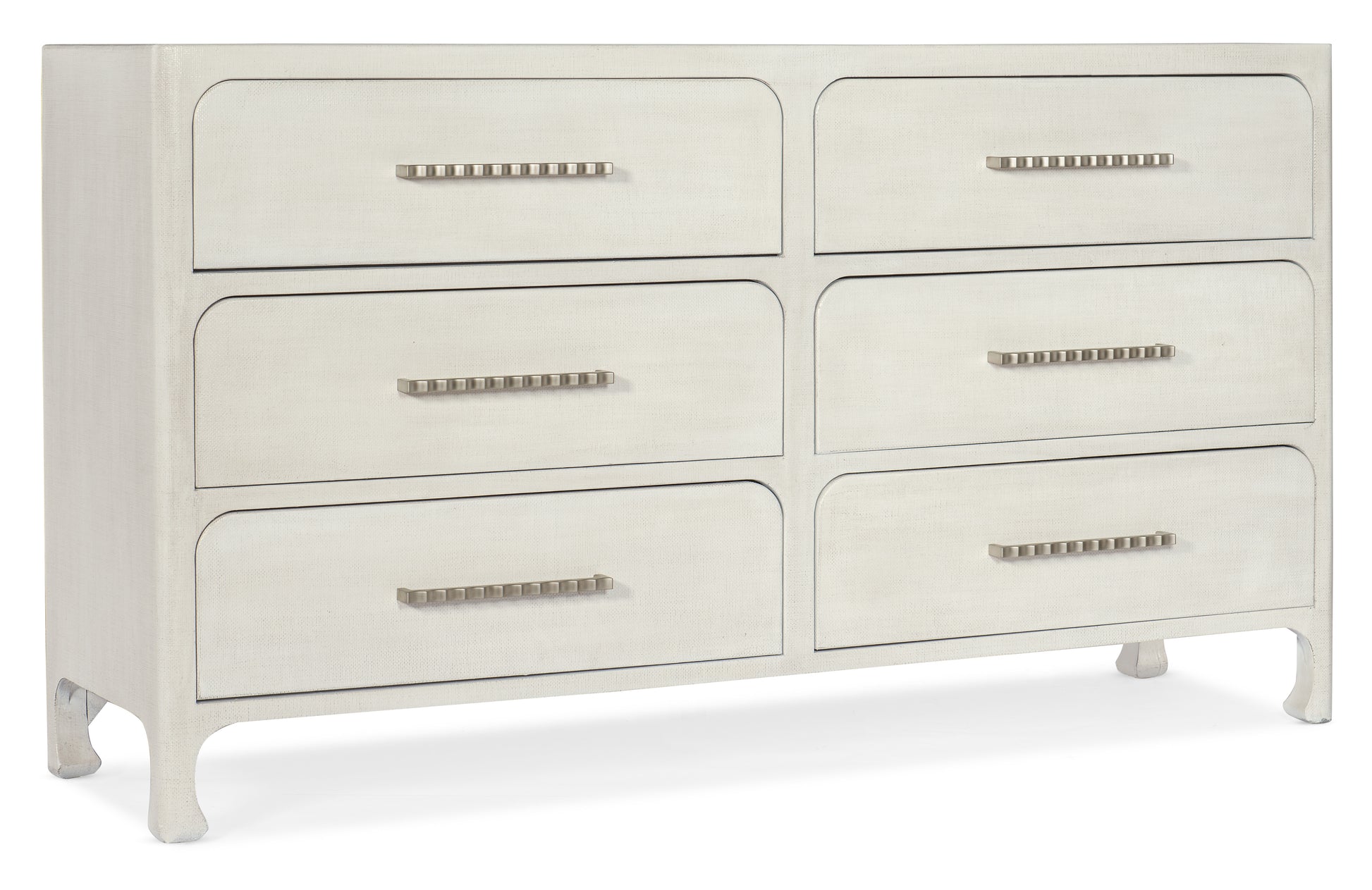 • Inspired by casual waterfront living with a chic sophistication, the Serenity Dresser is crafted of Wood and Raffia and finished in Sand Dollar, a white lacquered grasscloth