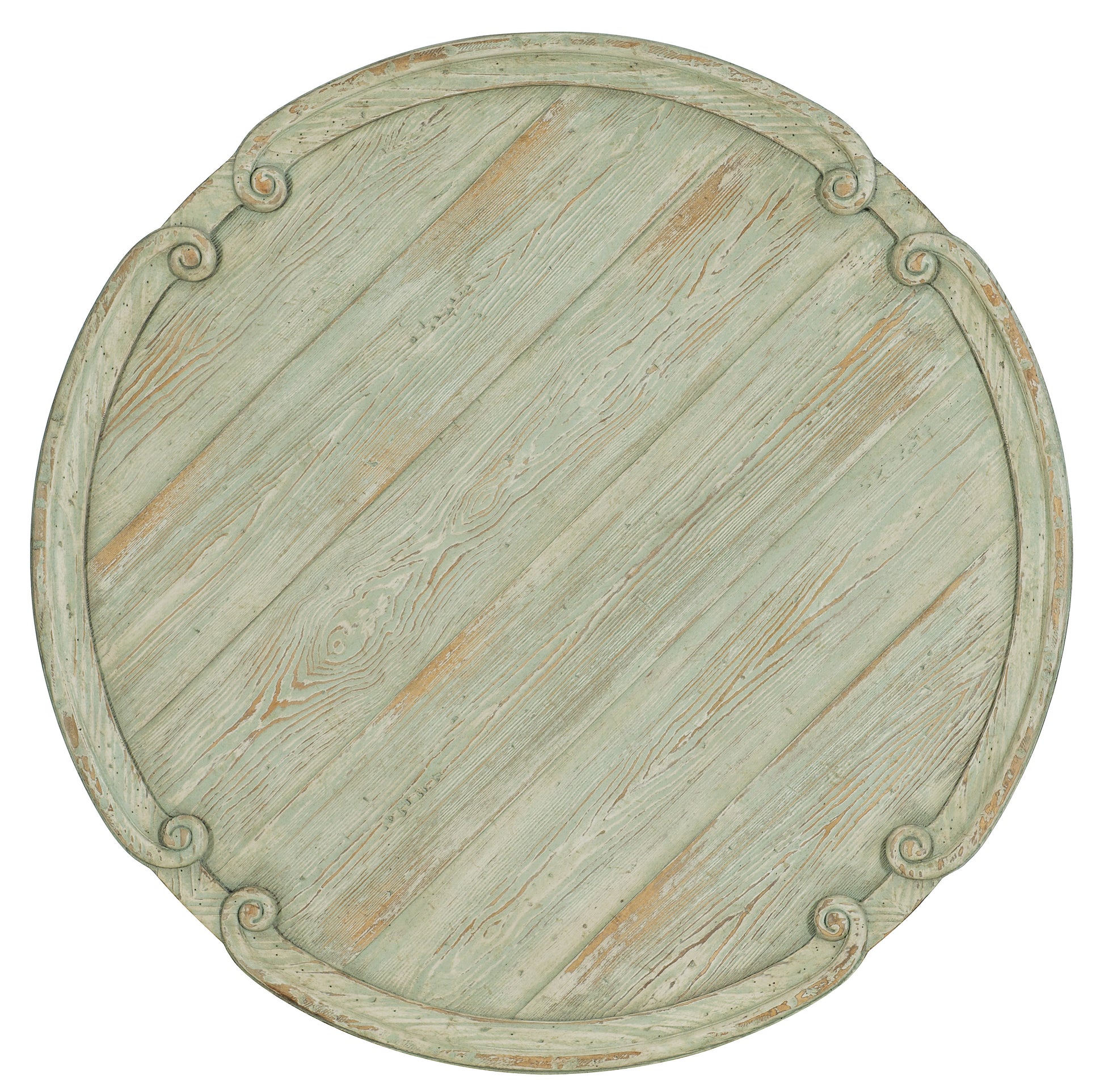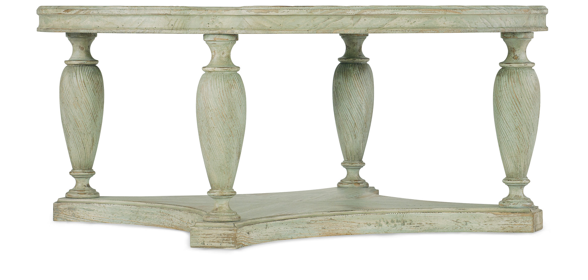 • Inspired by antiques and architecture of vintage character, the round Traditions Cocktail Table has a twist-leg design and exquisite scroll motif around the top edges
