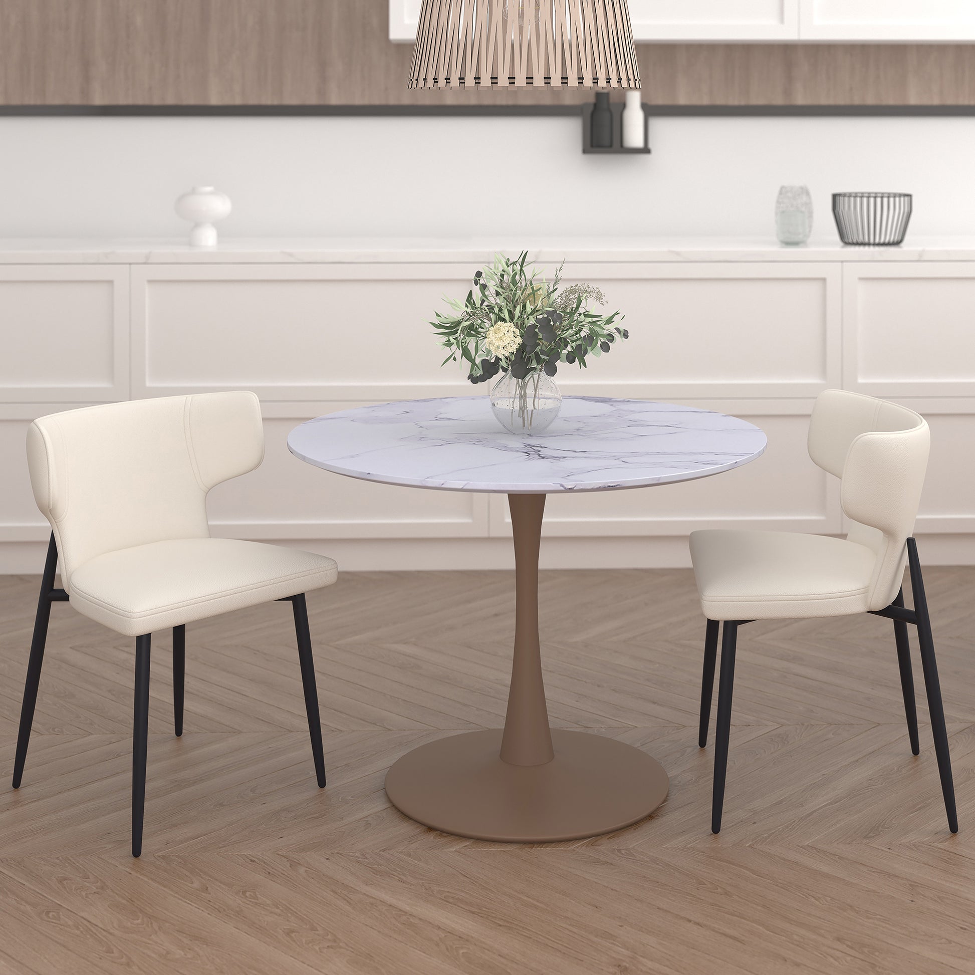• Finish:WHITE AND AGED GOLD TABLE/BEIGE CHAIR; Material:MDF/METAL/FAUX LEATHER